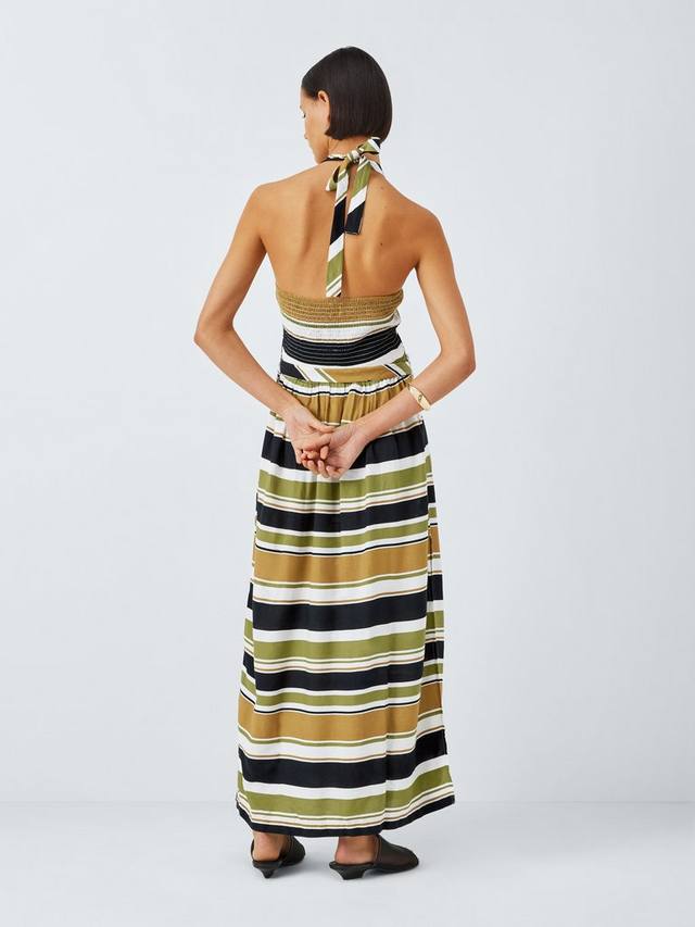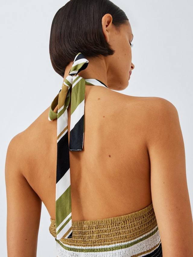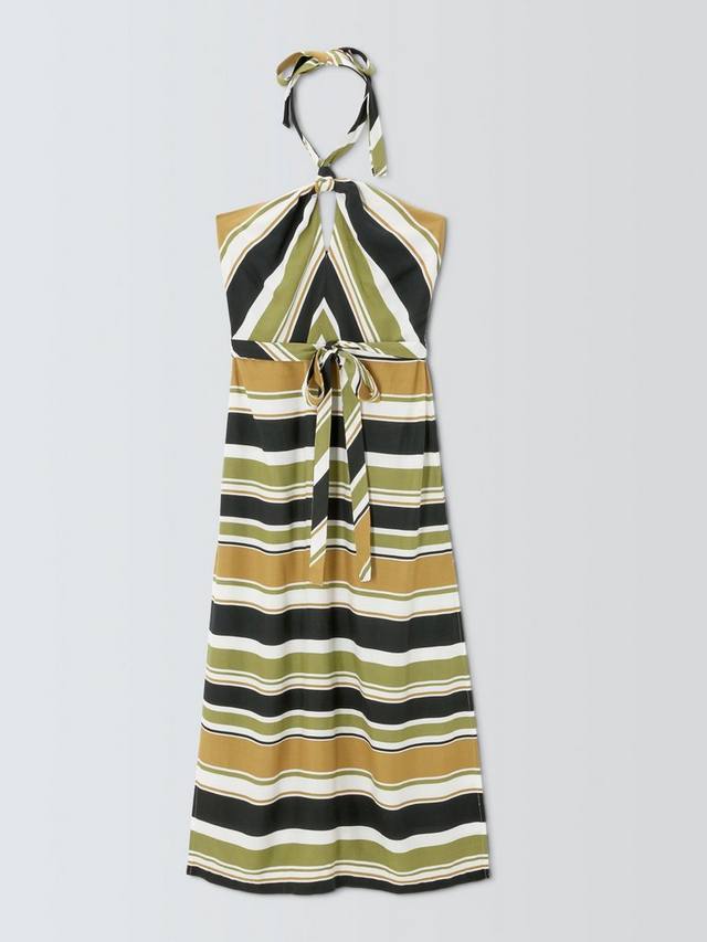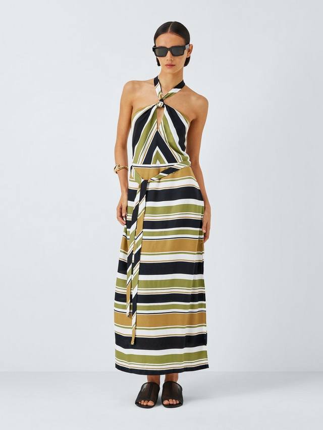 Это летнее макси-платье украшено полосками в тон зелёного, золотого и тёмно-синего цветов. Завязанный спереди узел образует вырез, а длинный завязывается на шее, открывая плечи. Завязка на талии завершает образ.