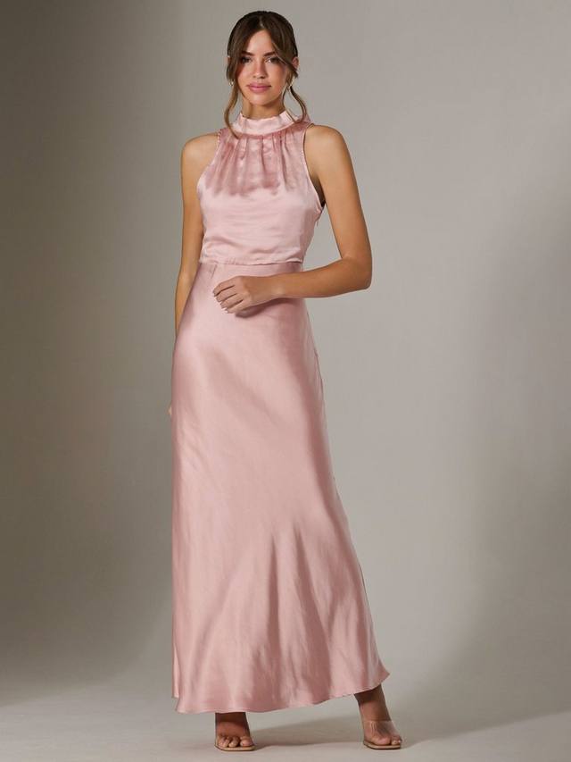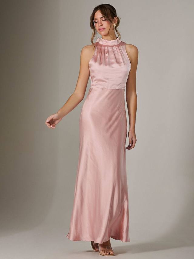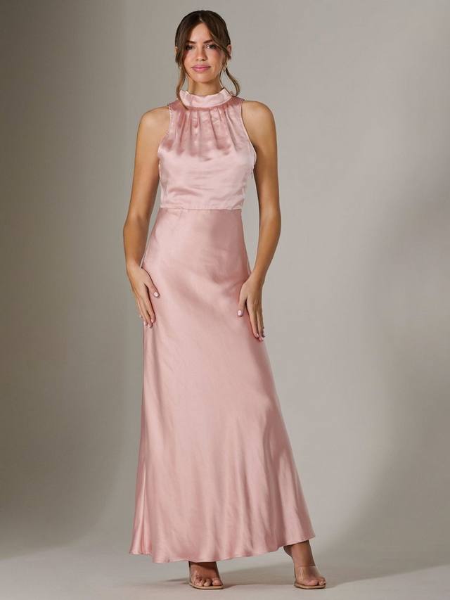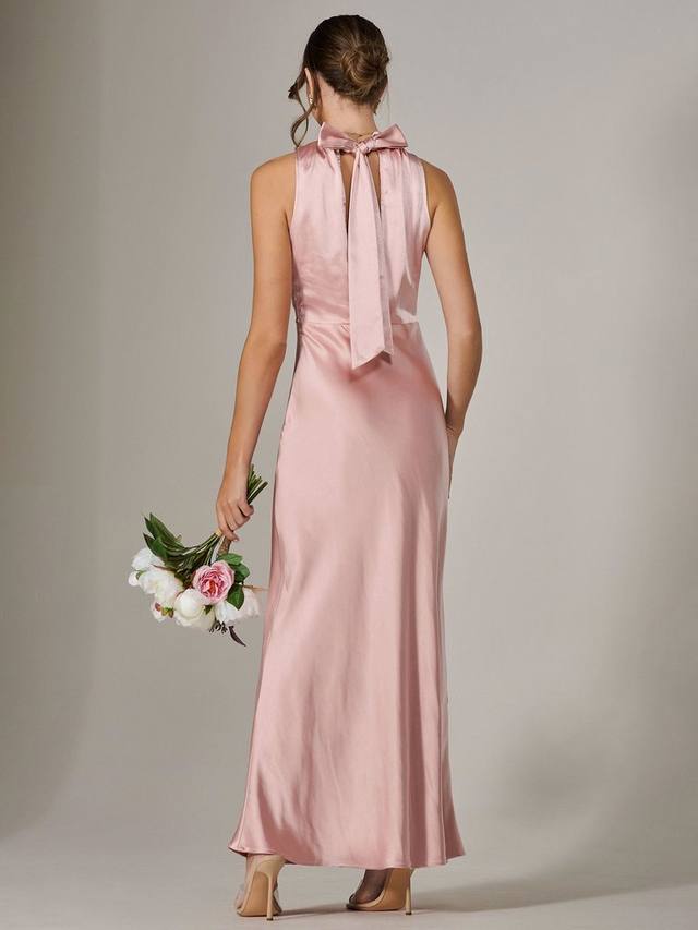 Почувствуйте себя великолепно в платье макси с вырезом халтер от Jolie Moi из роскошного атласа нежно-пастельно-розового цвета, идеально подходящем для вашей летней свадьбы. Элегантный и подчеркивающий достоинства силуэт делает это платье прекрасным вариантом и для подружек невесты: высокий вырез и облегающая юбка макси с расклешенным лифом идеально ниспадают по фигуре. Именно детали делают это платье таким особенным: плиссировка спереди, а также вырез-замочная скважина сзади с завязкой на шее – уникальный штрих, который непременно привлечёт внимание. Боковая молния делает это платье элегантным и удобным.