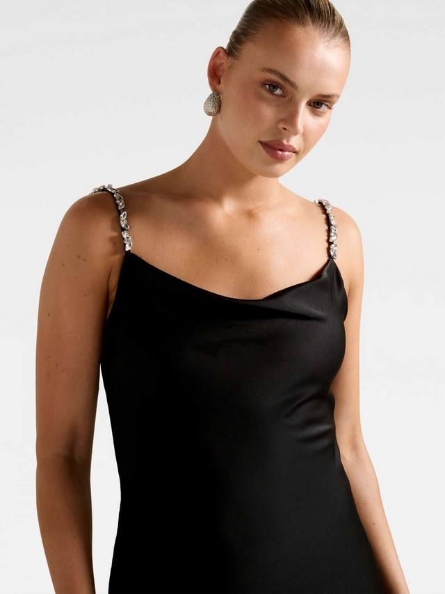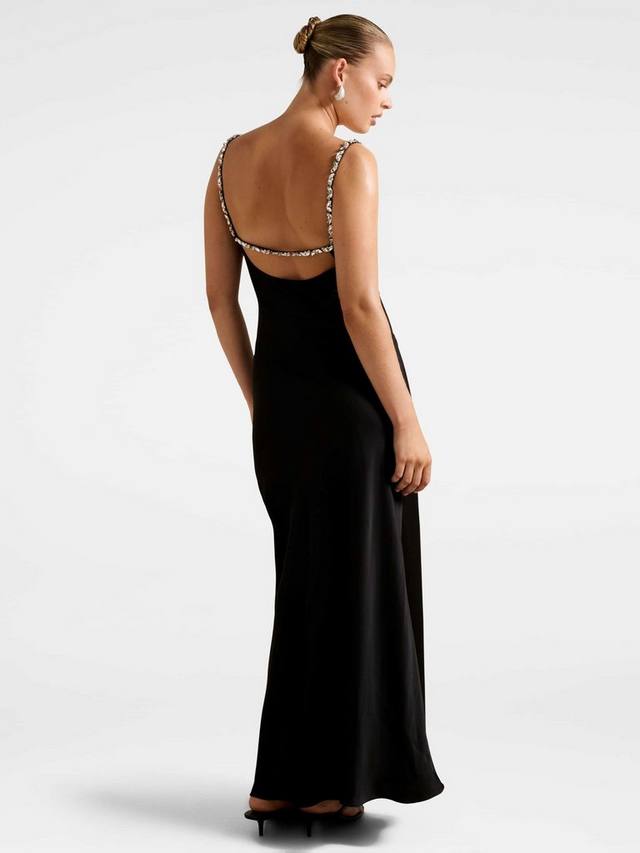 Это макси-платье сочетает в себе гладкий атлас с эффектной отделкой стразами, изящными бретельками-спагетти и соблазнительным круглым вырезом. Созданное для вечерних мероприятий, оно поможет вам выразить свою индивидуальность, обеспечивая комфорт и уверенность в себе на протяжении всего вечера.