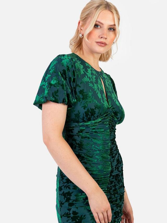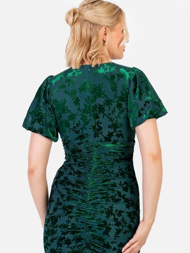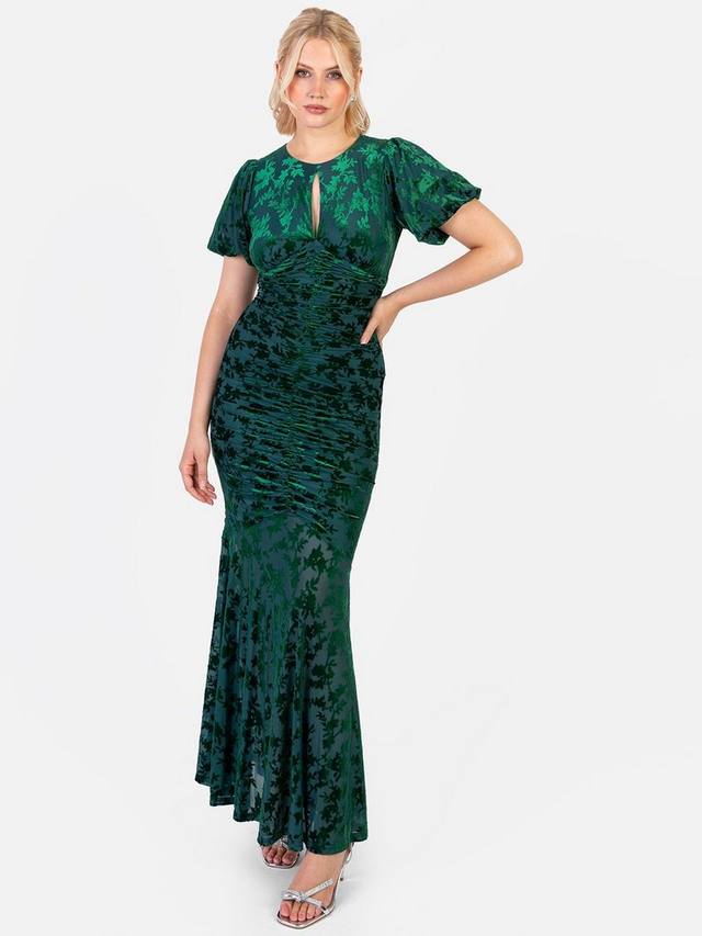 Это платье из бархата с ворсом и цветочным мотивом имеет круглый вырез, декор в виде замочной скважины и рукава-буфы. Платье с присборенной талией до колена переходит в струящуюся макси-юбку. Сочетайте с черными каблуками для создания поэтичного образа.
