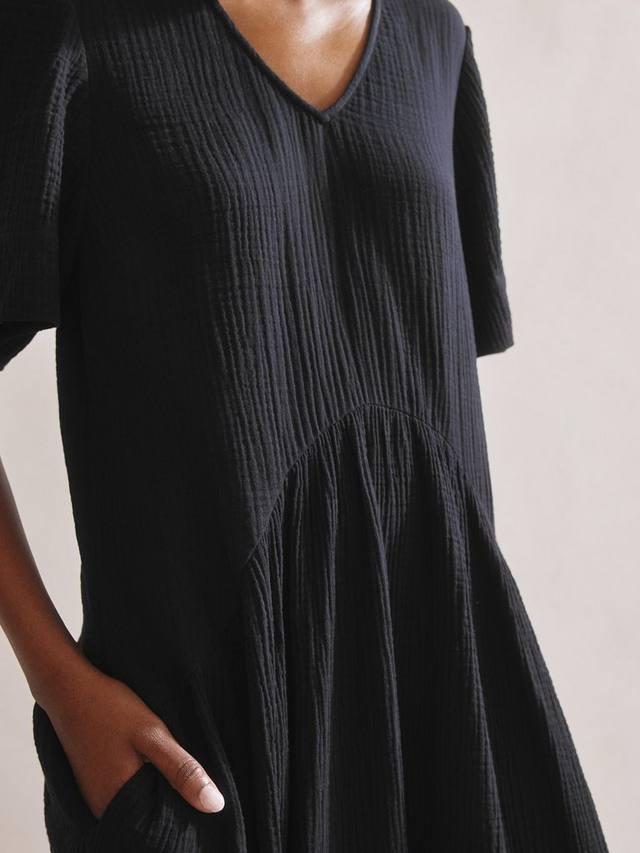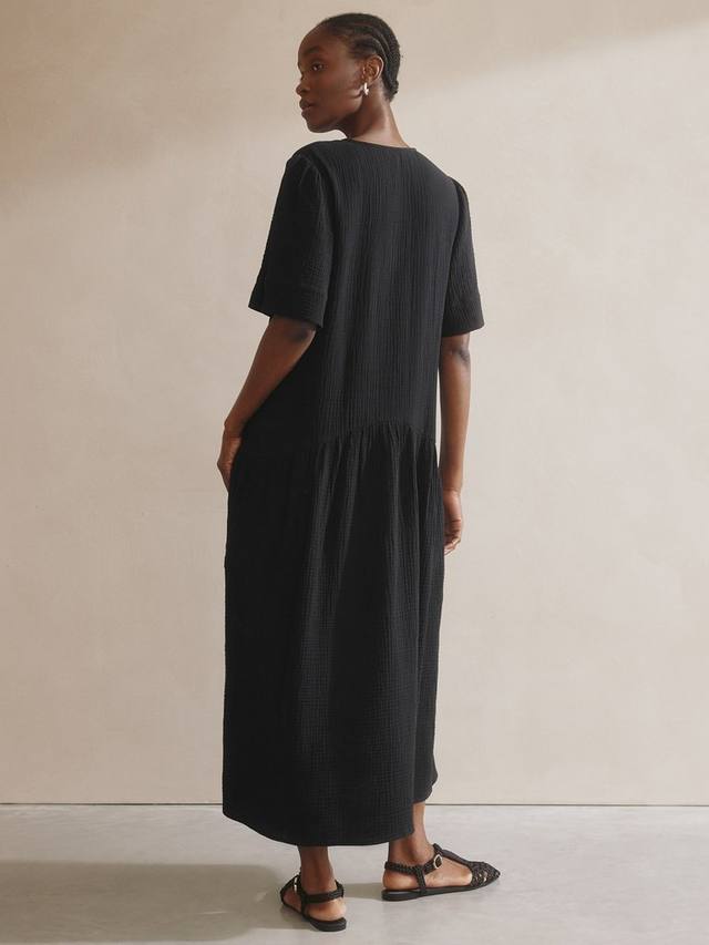Это макси-платье из марли сочетает в себе комфорт и стиль. Оно имеет изогнутую сборку на талии, глубокий V-образный вырез и удобные боковые карманы. Легкое и воздушное, это платье удобно носить и идеально подходит для упаковки вещей — глажка не требуется.