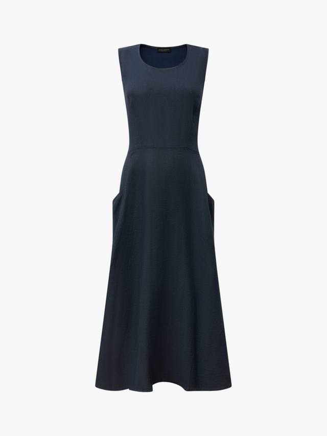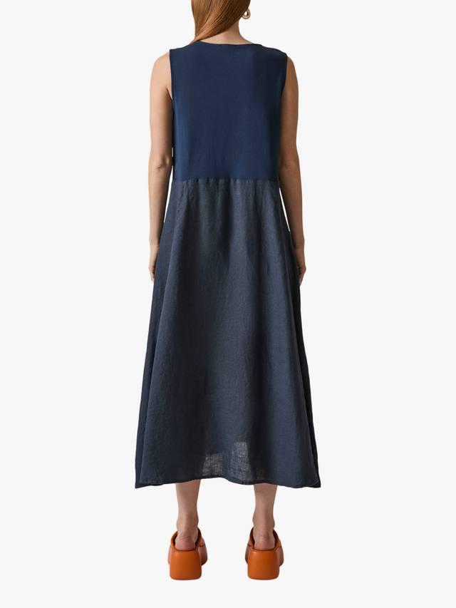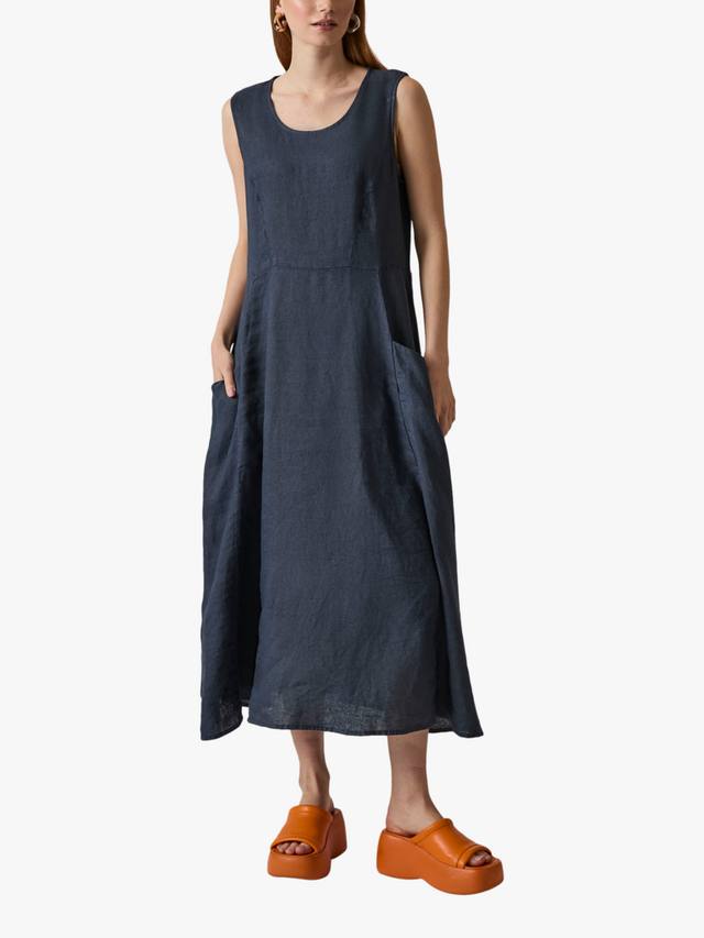 Это льняное платье макси от James Lakeland сочетает в себе стиль и комфорт. Без рукавов, с круглым вырезом, оно элегантно драпируется до щиколотки, создавая привлекательный А-образный силуэт. Дышащий лен сохраняет лёгкость. Боковые карманы добавляют практичности, а эластичная хлопковая вставка сзади улучшает посадку.