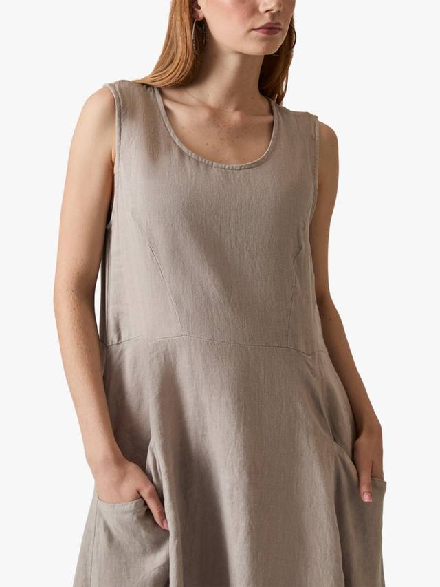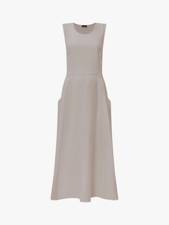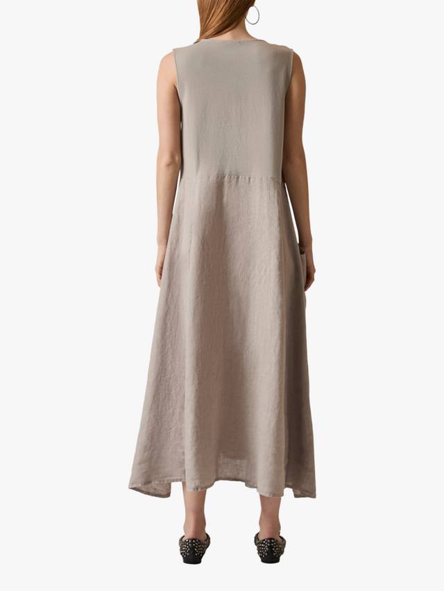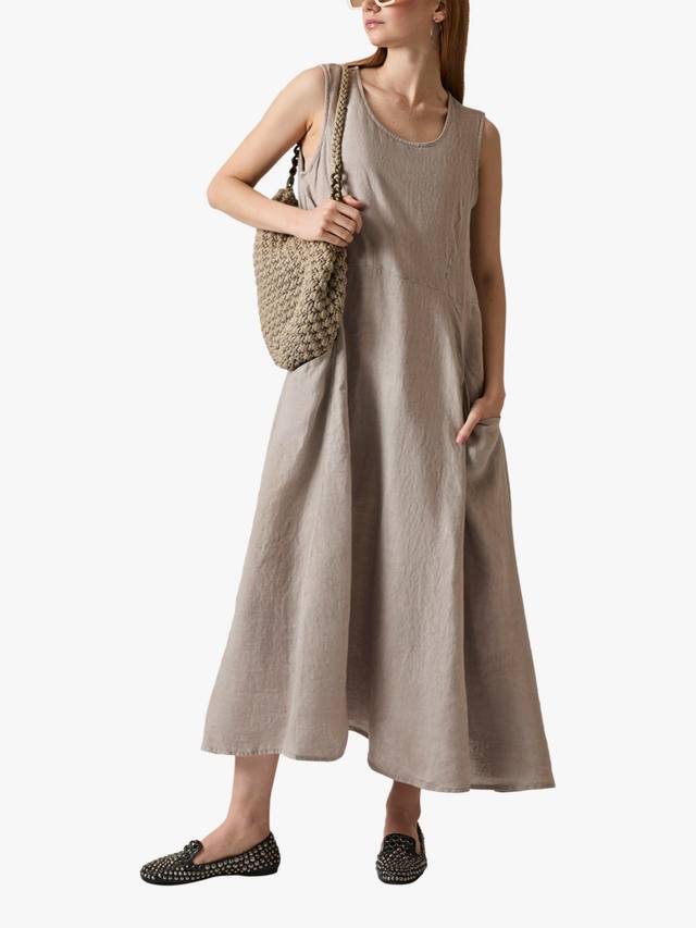 Это льняное платье макси от James Lakeland сочетает в себе стиль и комфорт. Без рукавов, с круглым вырезом, оно элегантно драпируется до щиколотки, создавая привлекательный А-образный силуэт. Дышащий лен сохраняет лёгкость. Боковые карманы добавляют практичности, а эластичная хлопковая вставка сзади улучшает посадку.