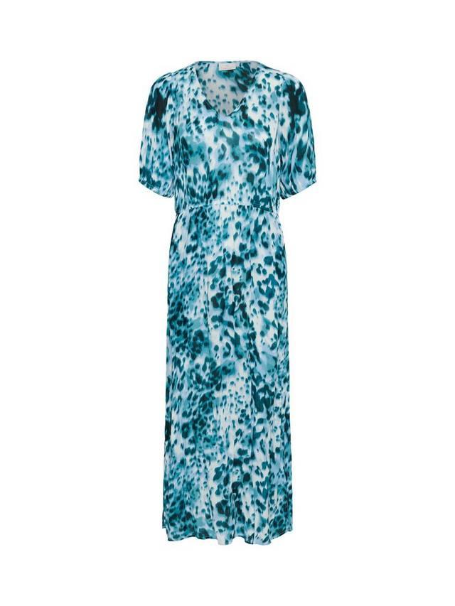 Это платье длиной в пол от KAFFE, подчеркивающее талию, идеально сшито из лёгкой вискозы. V-образный вырез и короткие рукава подчеркивают фигуру, а эффектный леопардовый принт сине-зелёного цвета идеально подходит для любого особого случая. Это платье добавит элегантности и стиля в ваш гардероб.