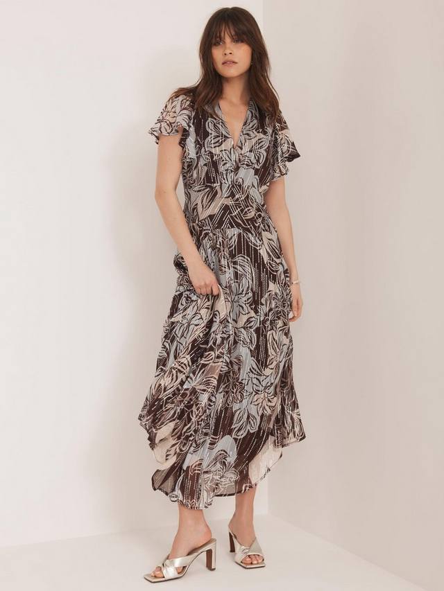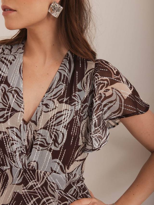 Платье макси с цветочным принтом, вплетенным металлизированной нитью, V-образным вырезом и короткими рукавами с оборками.