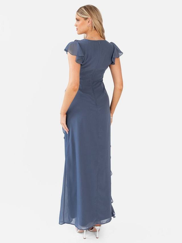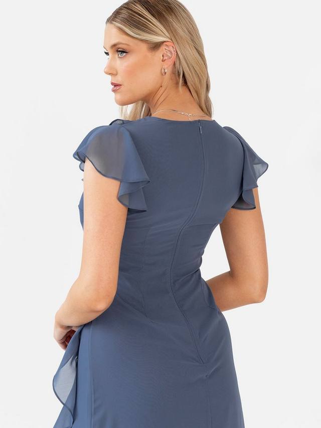 Это потрясающее платье, излучающее романтику и изысканность, воплощает современную элегантность. Лиф с рукавами-крылышками дополнен классическим V-образным вырезом. Каскадный слой оборок проходит по линии горловины и спускается по диагонали к бедру, а ещё одна оборка спускается от талии и переходит на юбку, придавая силуэту чарующую привлекательность. Дополните свой ансамбль серебряными туфлями на каблуке и аксессуарами для создания непринужденного образа.