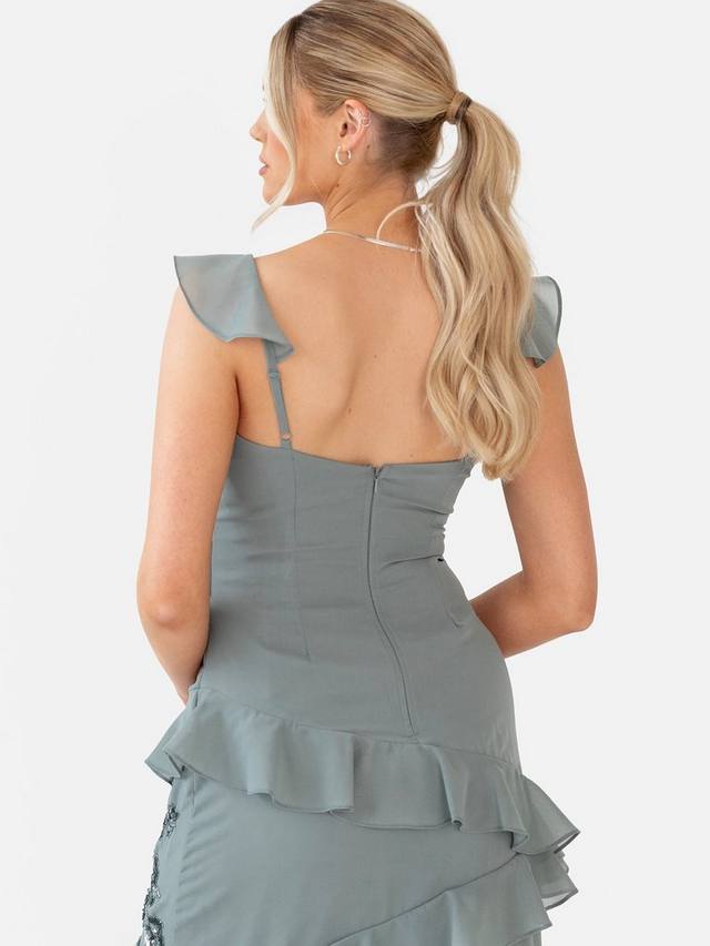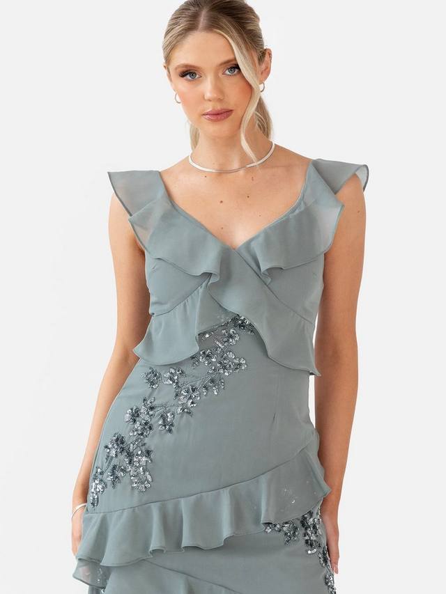 Это элегантное макси-платье украшено нежными цветочными украшениями и многоярусными оборками, которые каскадом ниспадают с регулируемых бретелей, изящно перекрещиваясь на облегающем лифе, создавая эффектную линию талии в стиле ампир. Асимметричные оборки струятся по макси-юбке, придавая ей мягкость и изысканный шарм. Это платье идеально подойдет для современной подружки невесты или любого вечернего торжества. Оно прекрасно сочетается с серебряными каблуками и изящными украшениями, создавая изысканный образ.