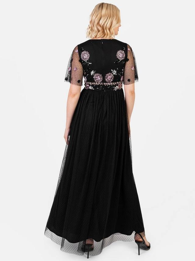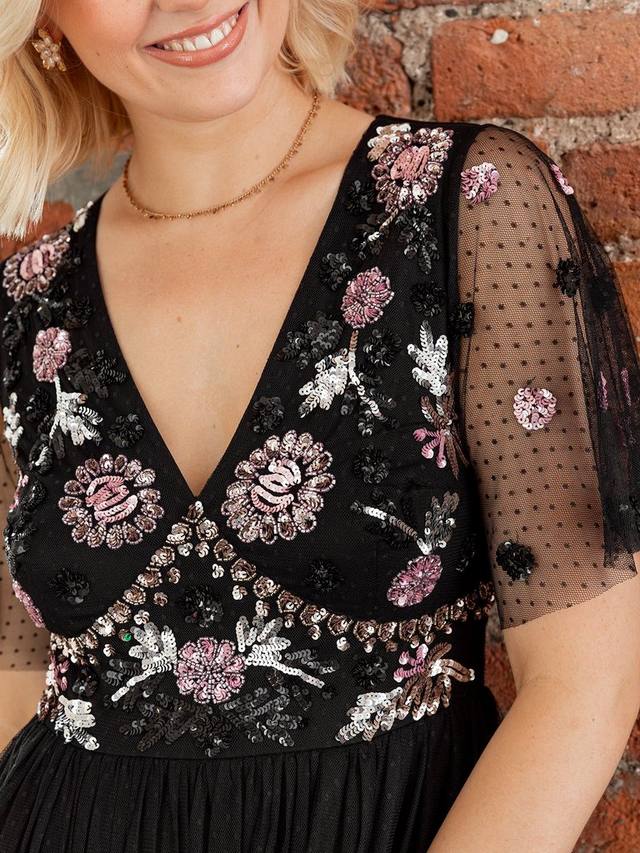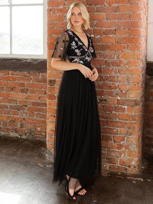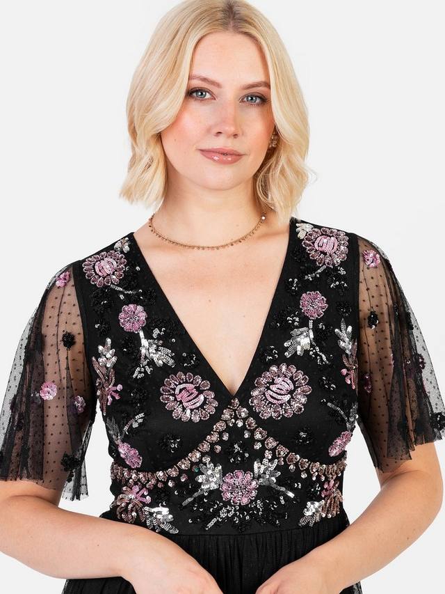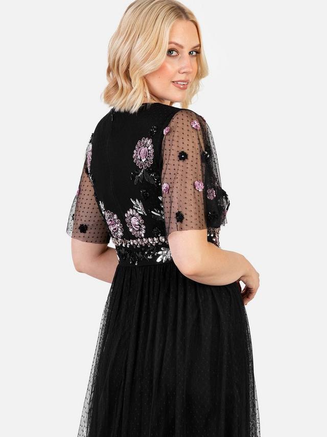 Пайетки и бусины образуют цветочные мотивы, украшающие лиф с V-образным вырезом и прозрачные короткие рукава. Пятнистый сетчатый тюль переходит в удобный А-силуэт.