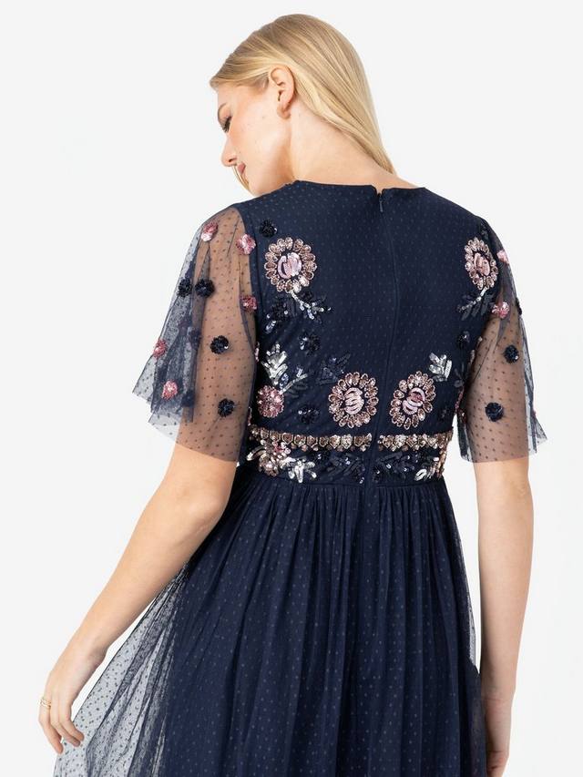 Известный своим использованием изысканных украшений и мягких тканей, бренд Maya создал очередной стиль, который не уступает по красоте. Тщательно расшитые пайетки и бусины образуют цветочные мотивы, элегантно дополняющие V-образный вырез лифа и короткие прозрачные рукава. Пятнистый сетчатый тюль переходит в А-образный силуэт, который подходит для любой фигуры и оставляет достаточно места для полуночного танго с лучшими подругами. Его оттенок делает это макси-платье универсальным, поэтому вы можете носить его снова и снова. Сочетайте его с розовыми аксессуарами для летней свадьбы или с золотыми мерцающими украшениями для вечернего вечера.