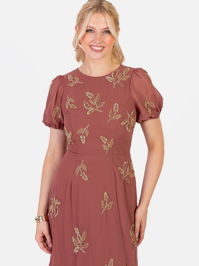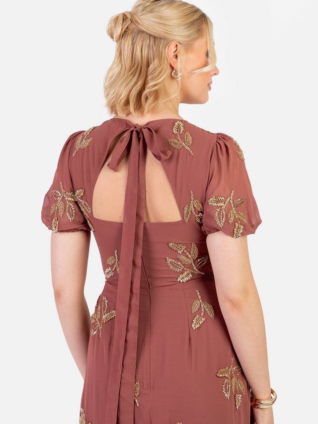 Это элегантное макси-платье из шифона с пришитыми вручную цветочными аппликациями имеет круглый вырез, рукава-буфы и вырез-капельку на спине с завязывающимися лентами. Дополните его туфлями на каблуке с ремешками и клатчем для создания эффектного образа, неподвластного времени.