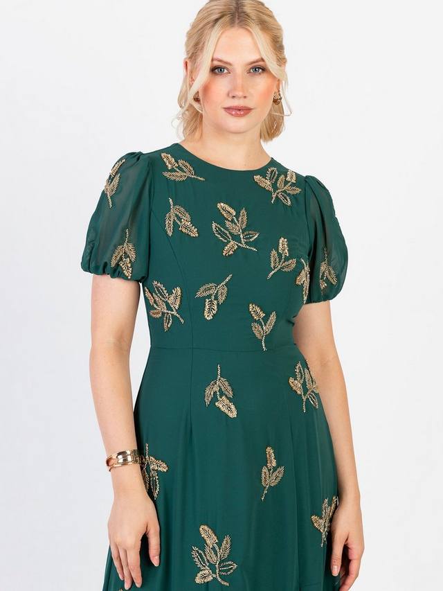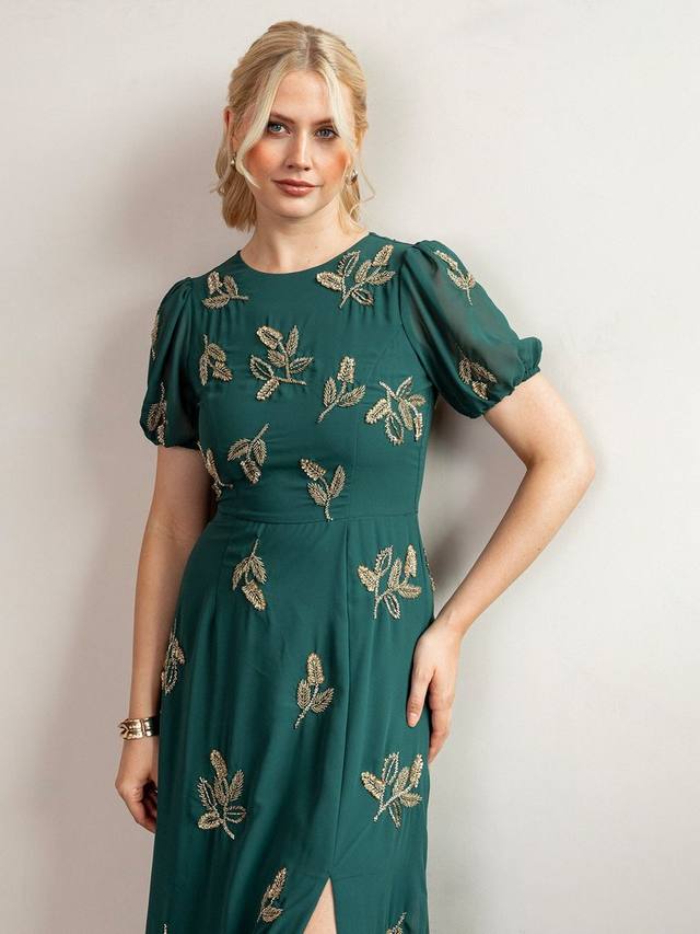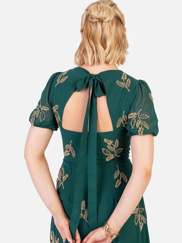 Это элегантное макси-платье из шифона с пришитыми вручную цветочными аппликациями имеет круглый вырез, рукава-буфы и вырез-капельку на спине с завязывающимися лентами. Дополните его туфлями на каблуке с ремешками и клатчем для создания эффектного образа, неподвластного времени.