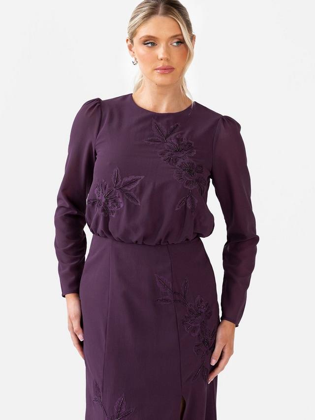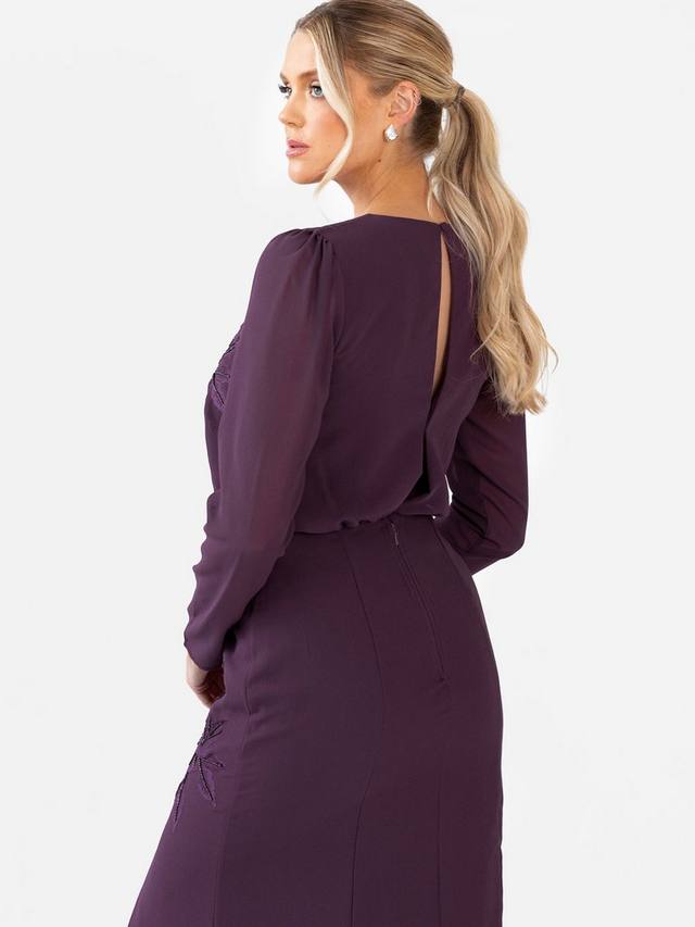 Окутайте себя элегантностью в этом изысканном и романтичном платье – идеальном выборе для торжеств в прохладное время года. Платье из жоржета имеет круглый вырез и длинные рукава. Лиф с мягкой драпировкой присборен на талии, создавая эффектную посадку. Двойной вырез-капелька на спине приоткрывает тело.