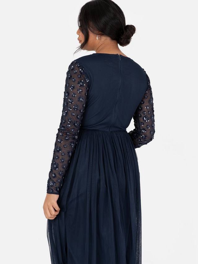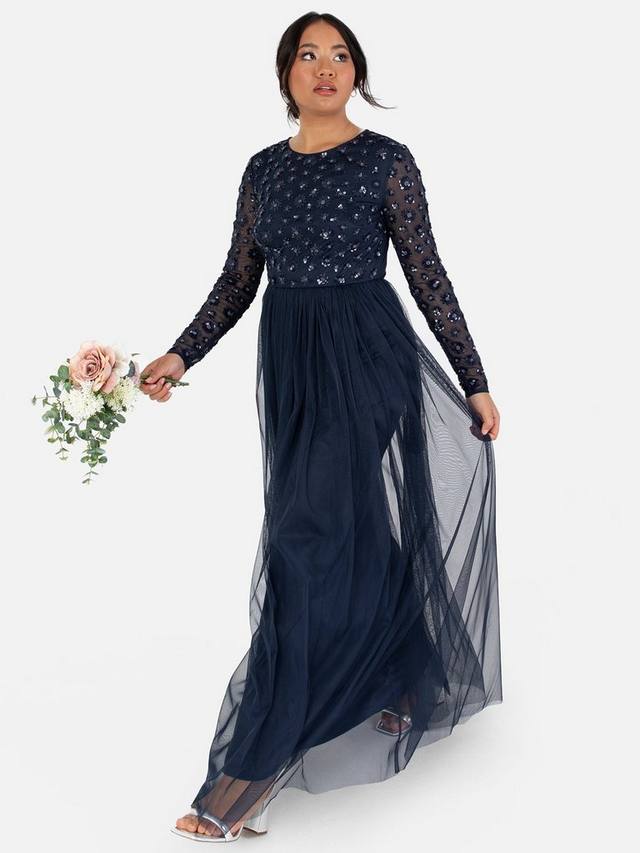 Круглый вырез лифа с длинными рукавами излучает скромное очарование, украшенное нежными цветочными мотивами, вручную расшитыми пайетками и бисером. Юбка макси из тюля, верная классическому стилю подружек невесты от Майи, изящно расширяется от талии, переходя в изящный А-силуэт. Дополните образ, дополнив это платье до пола серебряными туфлями на каблуках и изящными серьгами. Это платье также идеально подходит для других особых случаев, таких как церемонии награждения, вечерние балы и мероприятия с красной дорожкой.