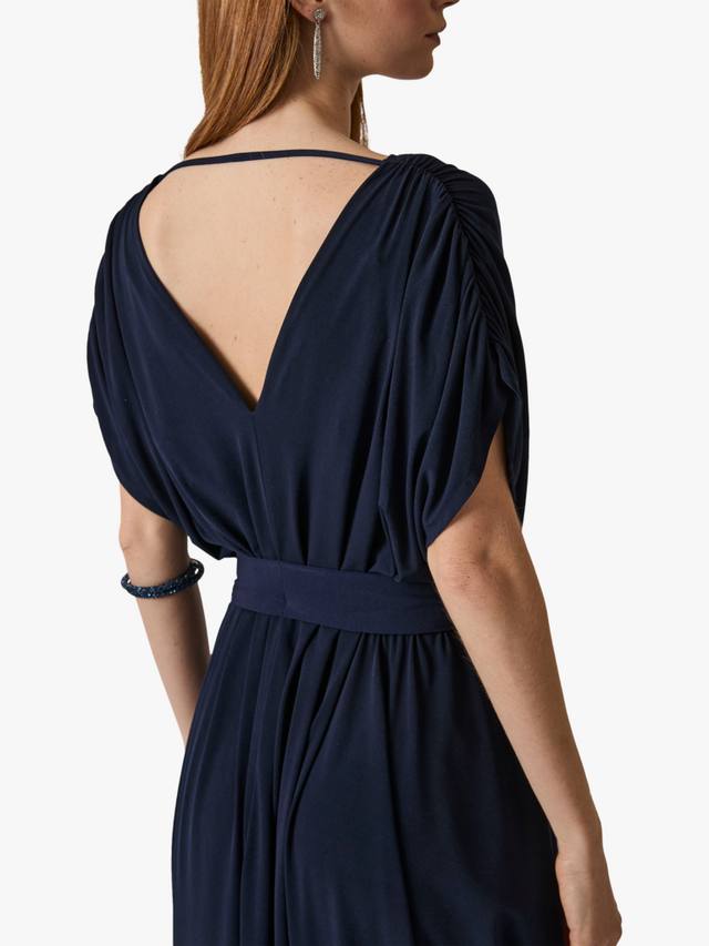 Это макси-платье James Lakeland с драпировкой воплощает греческую элегантность благодаря глубокому V-образному вырезу и мягкой, струящейся ткани. Приталенный пояс и соответствующий пояс подчеркивают фигуру, а эффектные рукава летучая мышь добавляют движения. Спинка повторяет V-образный вырез спереди, а изящная бретелька добавляет структуры. Длинная юбка грациозно ниспадает каскадом струящейся драпировки, создавая эффектный силуэт.