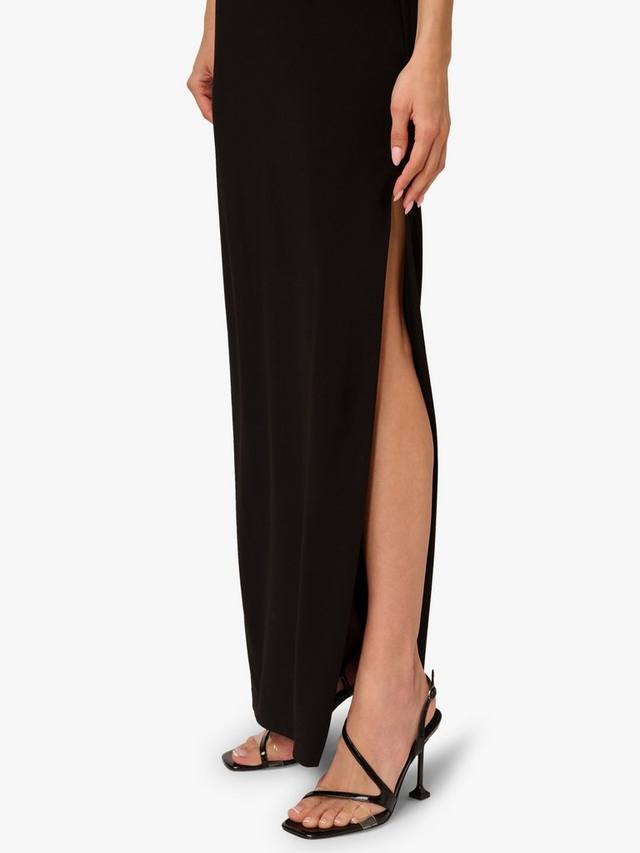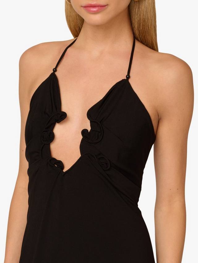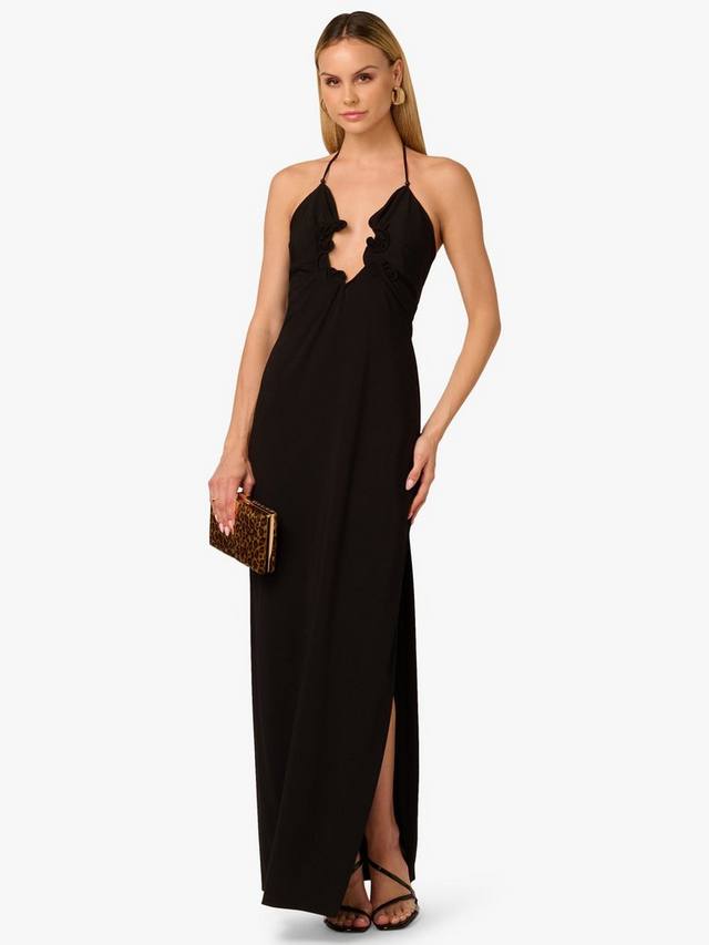 Это эффектное платье, минималистичное по форме, но богатое деталями, выполнено из джерси с струящимся силуэтом, который легко скользит по фигуре. Вырез-халтер на бретельках украшен изящными бусинами, а глубокий перед обрамлен скульптурным проволочным узором, создающим искусный акцент. Разрез сбоку добавляет движения и нотку драматизма. Это вечернее платье идеально подходит для торжественных случаев в стиле черный галстук, свадеб в теплую погоду или вечерних мероприятий за границей. Оно одновременно изысканное и смелое.