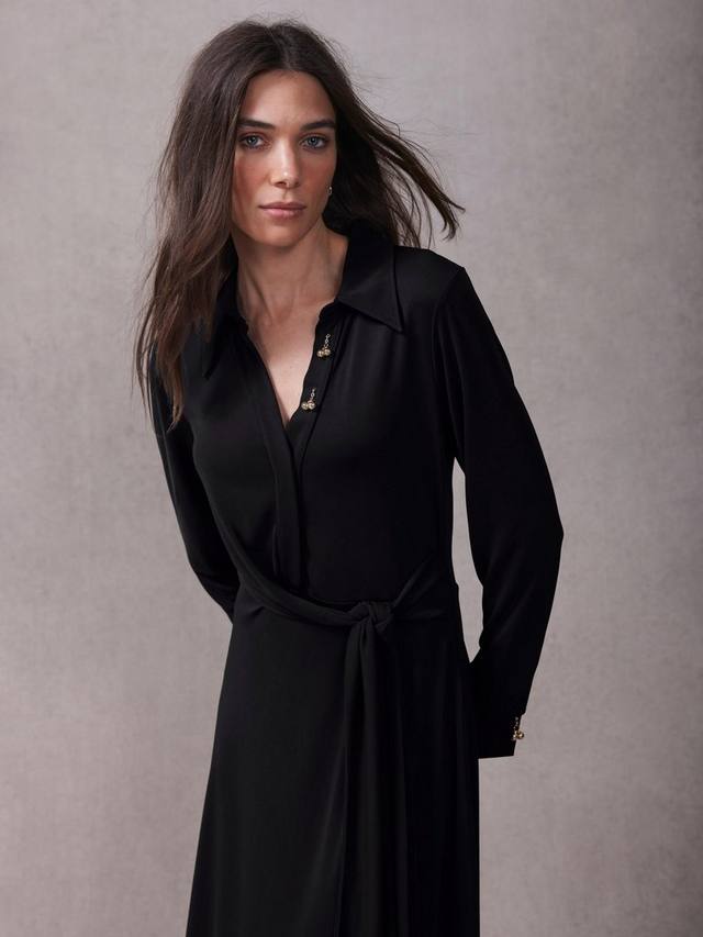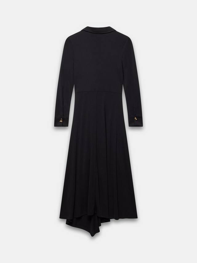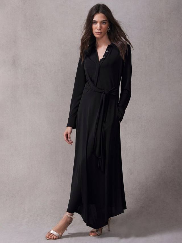 Платье макси с классическим воротником, V-образным вырезом, пуговицами металлического оттенка, длинными рукавами, манжетами с пуговицами, асимметричным нижним краем и завязкой сбоку.