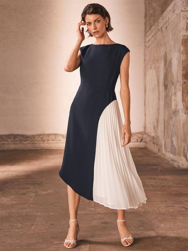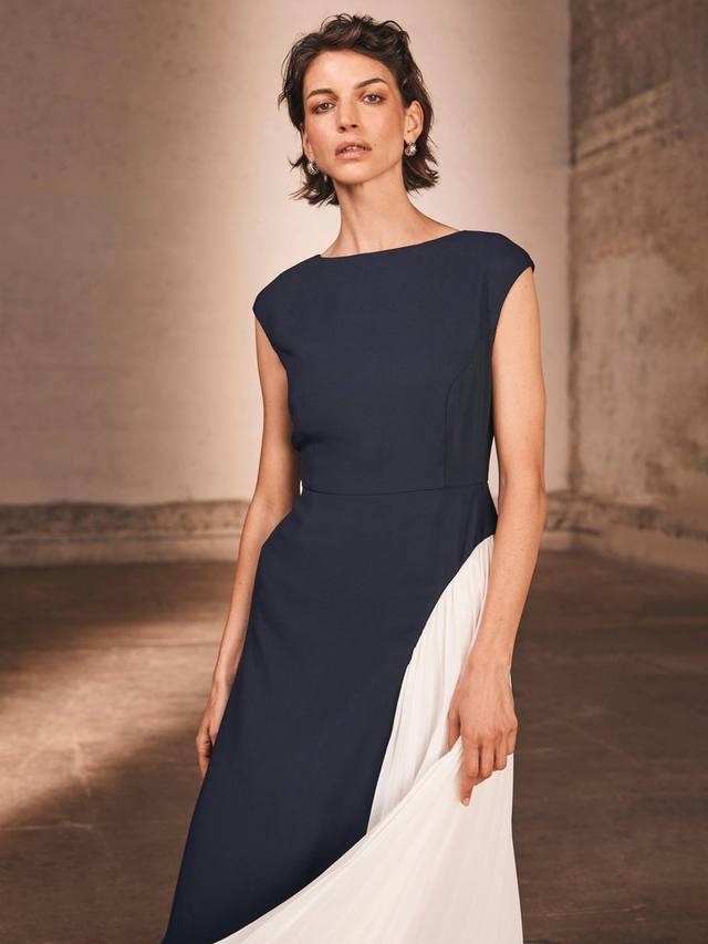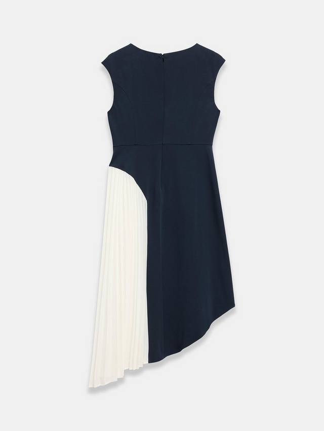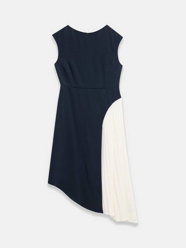 Темно-синее платье макси с цветовыми блоками, круглым вырезом, короткими рукавами, плиссированной вставкой, асимметричным нижним краем и застежкой-молнией на спине.