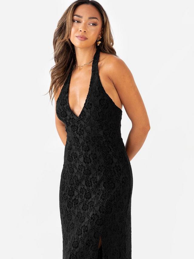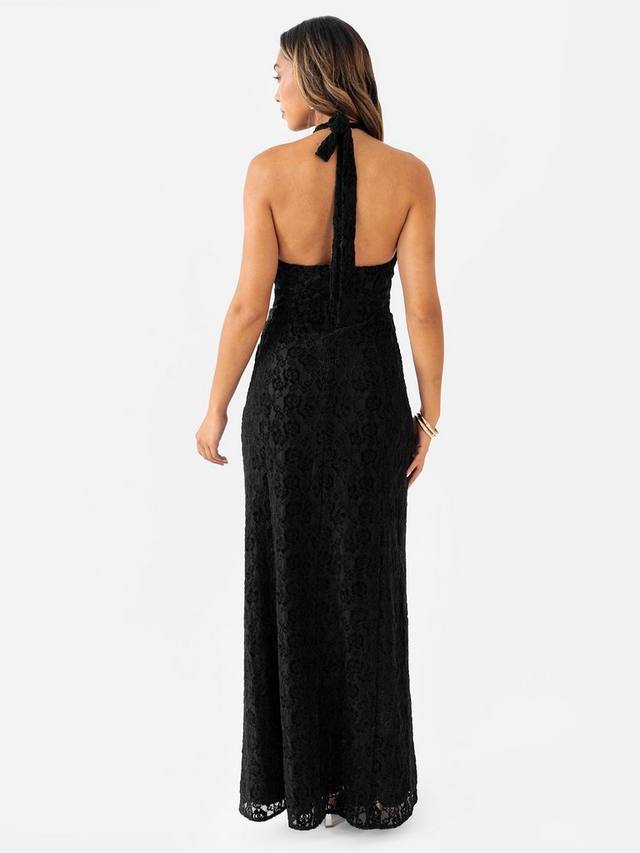 Это платье из богато фактурного бархата с цветочным принтом излучает роскошь, демонстрируя при этом уверенный минималистичный силуэт. Глубокий V-образный вырез обрамляет зону декольте, искусно сформированную завязкой-халтер, которая завязывается мягким бантом на затылке, открывая смелую открытую спину. Приталенный лиф переходит в юбку А-силуэта, струящуюся до пола, а смелый боковой разрез приоткрывает ногу при каждом шаге. Дополните это цветочное платье золотыми аксессуарами и локонами в голливудском стиле для создания гламурного образа без лишних усилий.