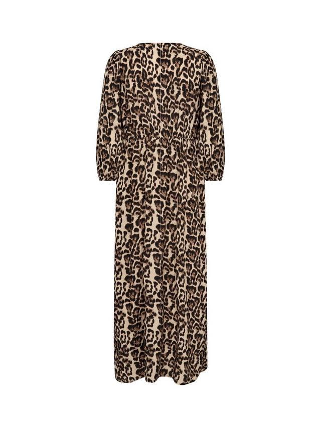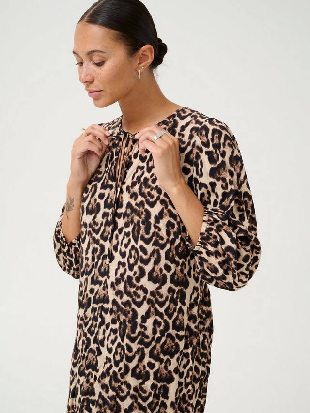 Это длинное платье свободного прямого силуэта от KAFFE сшито из лёгкой вискозы. Вырез горловины завязывается, рукава три четверти и леопардовый принт.