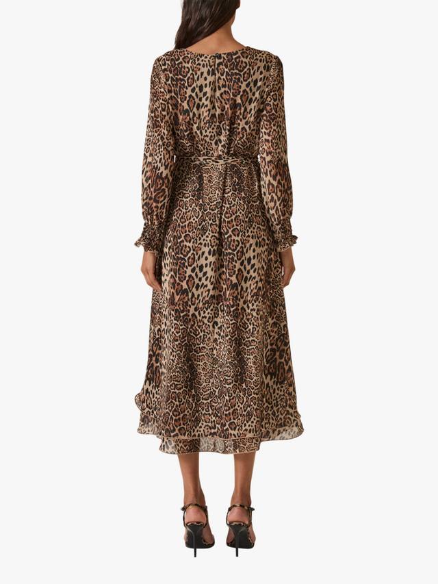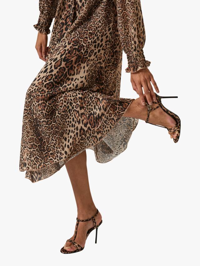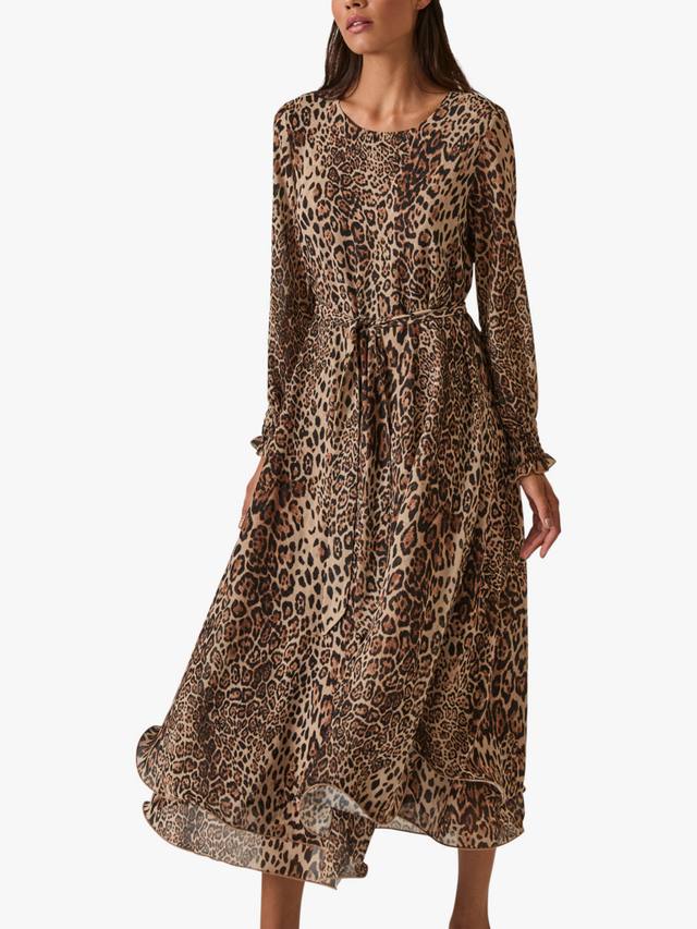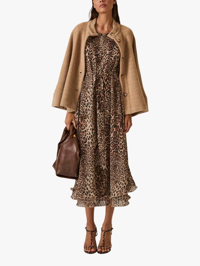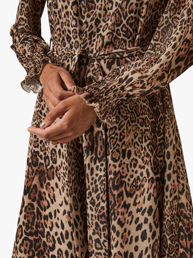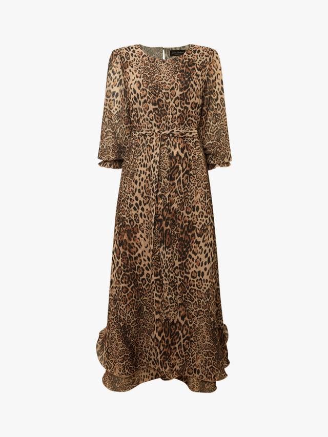 Это элегантное макси-платье от James Lakeland выполнено из лёгкого шифона и украшено ярким леопардовым принтом по всей поверхности. Свободный силуэт дополняет съёмный пояс из той же ткани, который продевается через незаметные шлёвки по бокам, позволяя регулировать линию талии. Круглый вырез горловины и застёжка на одну пуговицу сзади создают лаконичный, изысканный образ. Многослойный волнистый подол добавляет грациозности движениям, а длинные рукава с присборенными манжетами обеспечивают комфорт и лёгкий объём.