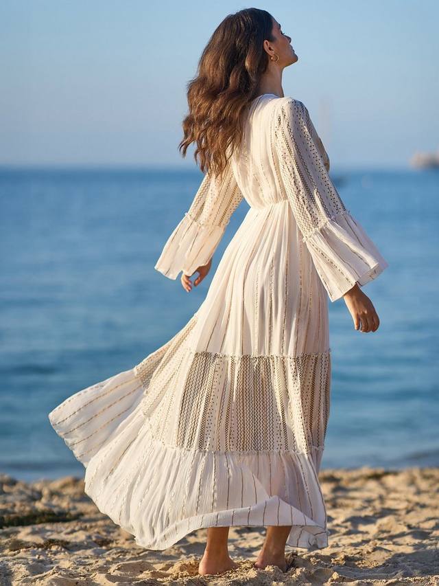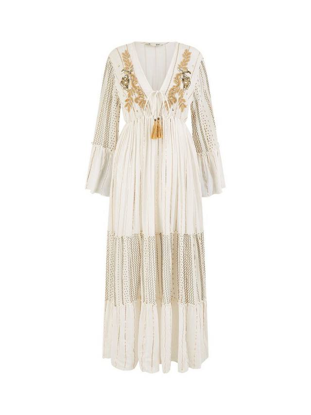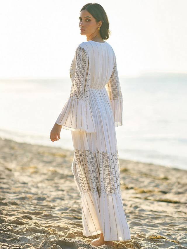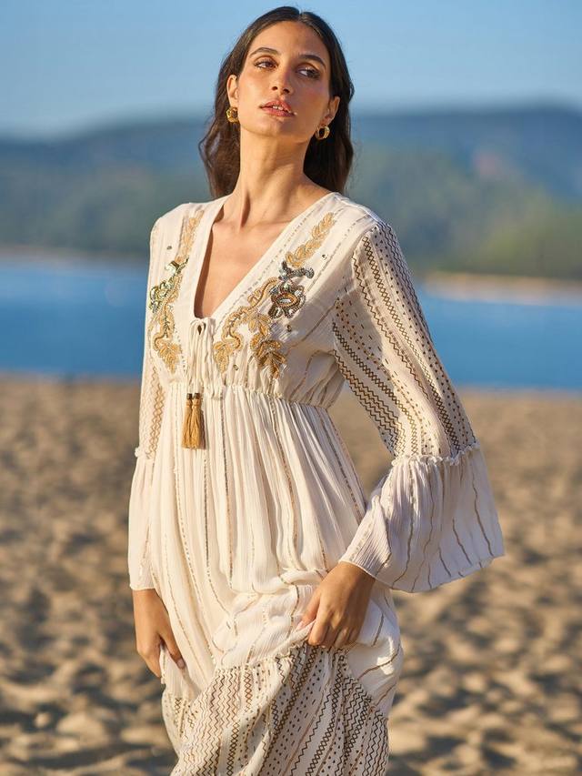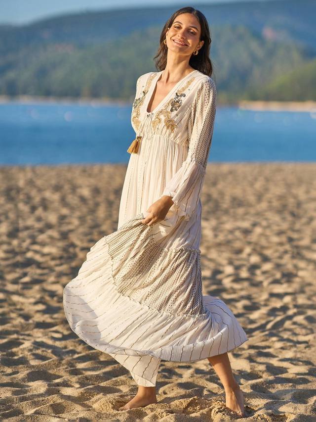 Металлические детали, струящиеся рукава, завязывающийся вырез и вышивка бисером — в этом макси-платье есть всё. Такой фасон достоин носиться на солнце и будет идеально смотреться на любом курорте. Макси-длина из вискозной ткани обеспечит вам комфорт и прохладу в любую погоду. Многоуровневый дизайн подчёркивается полосатой строчкой; нам нравится носить это платье с парой сандалий и большими солнцезащитными очками Sunnie, чтобы завершить образ.