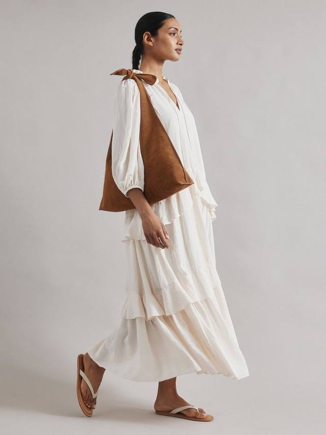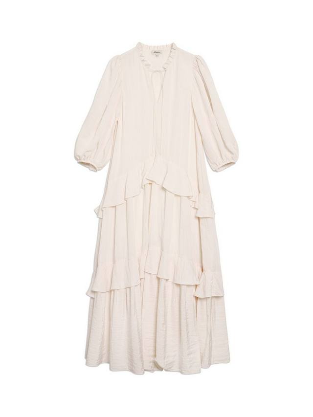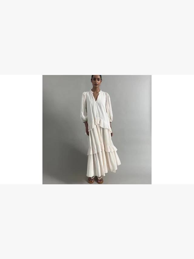 Это многоярусное платье макси объёмного кроя сочетает в себе комфорт и стиль. Воротник-оборка с V-образным вырезом на завязке и рукава 3/4. Мягкие многоярусные оборки по всему телу делают это платье лёгким и воздушным, идеальным летним нарядом.