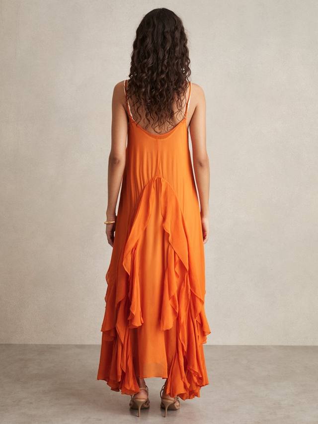 Это платье длиной до пола от Reiss, выполненное по А-силуэту с каскадными оборками, сшито из лёгкой и воздушной вискозы. Овальный вырез и тонкие бретельки, а также яркий оттенок превращают этот простой фасон в нечто особенное.