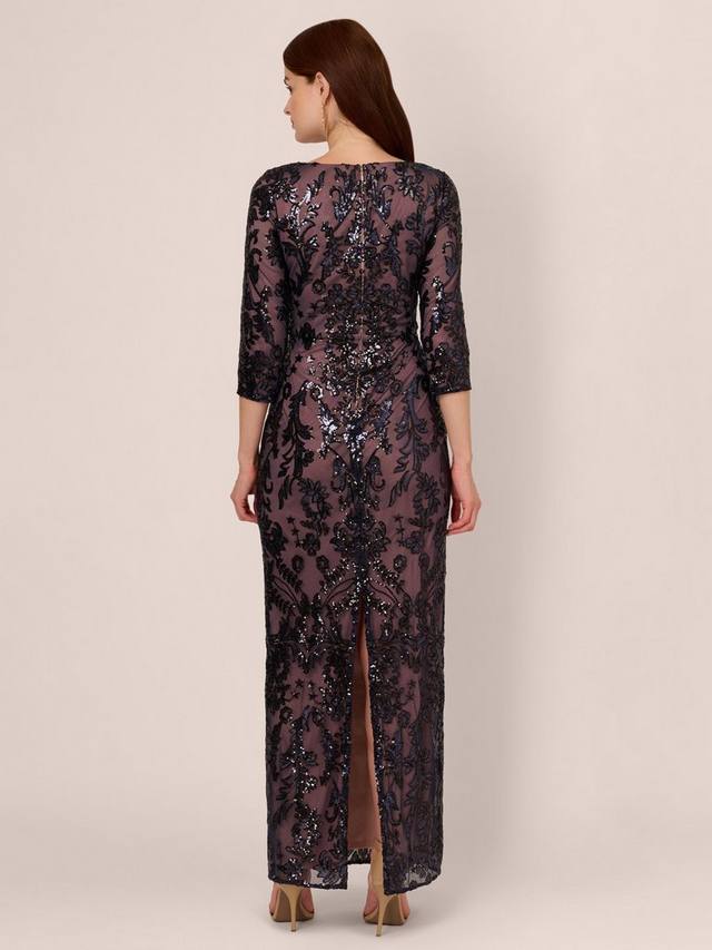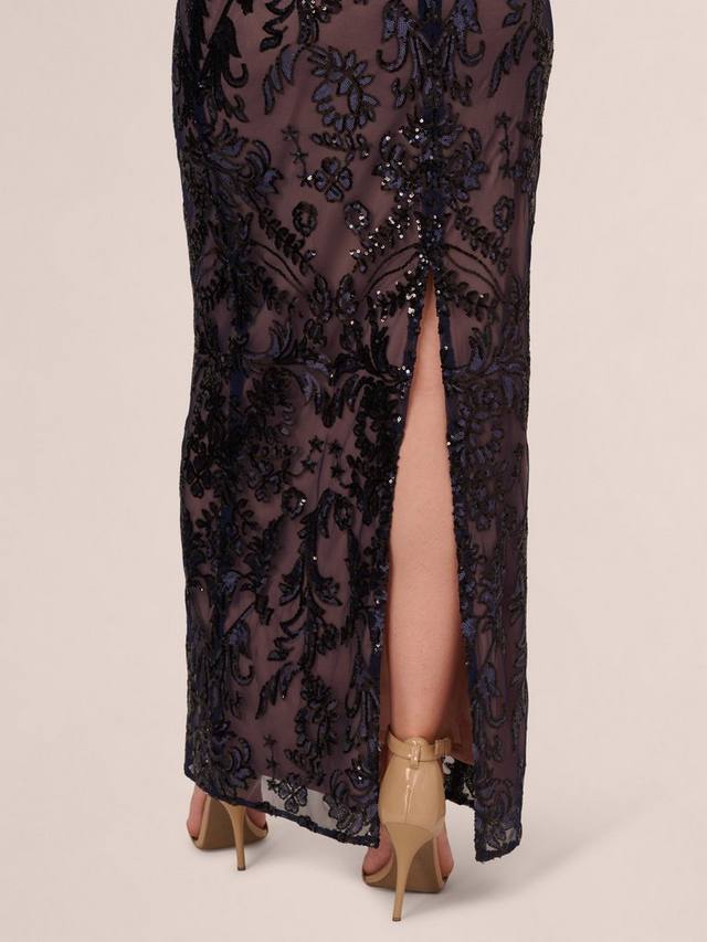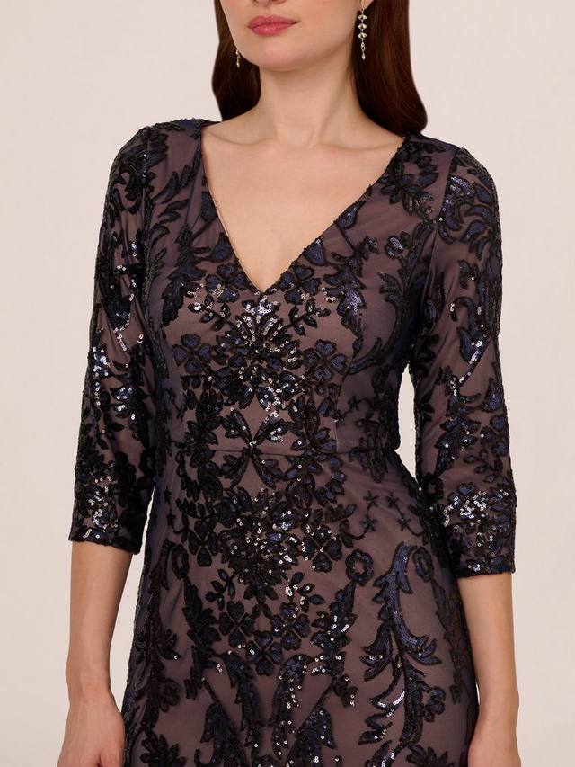Осветите вечер ослепительным блеском, надев это вечернее платье с пайетками. Это вечернее платье с облегающим лифом с V-образным вырезом, рукавами три четверти и юбкой облегающего кроя. Платье выполнено из прозрачной сетчатой ткани, открывающей подкладку, и украшено ослепительными пайетками с цветочным узором. Это платье с рукавами три четверти имеет разрез сзади на юбке для свободы движений. Потайная застежка-молния по центру спинки завершает образ. Дополните это платье с пайетками туфлями на каблуках телесного цвета и клатчем, чтобы создать образ, идеально подходящий для официальной свадьбы или торжественного мероприятия.