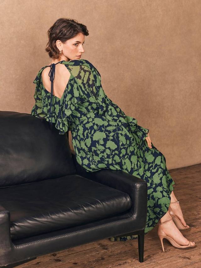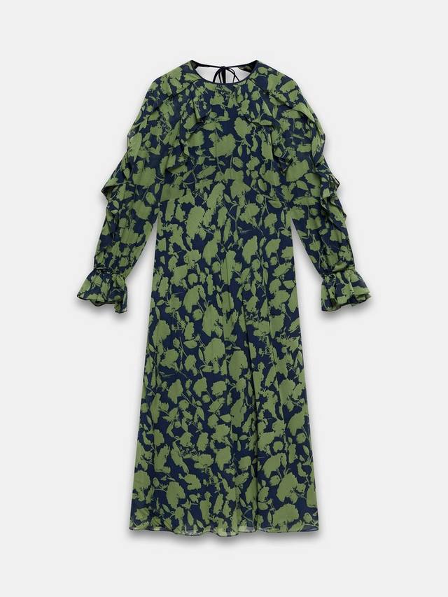 Платье с цветочным принтом макси-силуэта, круглым вырезом, оборками, длинными рукавами, рифлеными манжетами и открытой спиной с завязкой на спине.