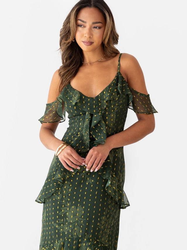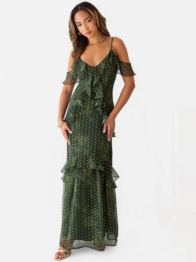 Это женственное и элегантное шифоновое платье с открытыми плечами отличается лифом с оборками, нитяными акцентами и струящейся юбкой макси А-силуэта. Идеально подходит как для дневного, так и для вечернего образа — просто добавьте золотые каблуки и эффектные серьги для потрясающего завершения.