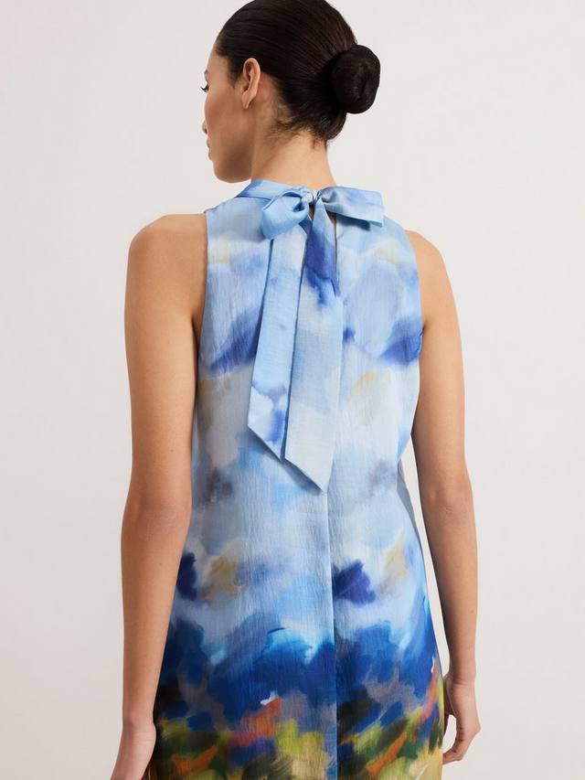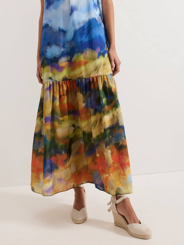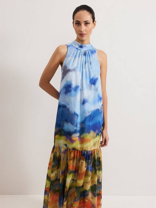 Платье макси, вдохновленное Моне, отличается яркими цветовыми завитками, создавая поистине эффектный образ для торжества. Спущенный подол удлиняет силуэт, создавая стройную посадку и плавные движения, а элегантный бант сзади завершает образ. Дополните образ нейтральными аксессуарами, и пусть этот потрясающий стиль говорит сам за себя.
