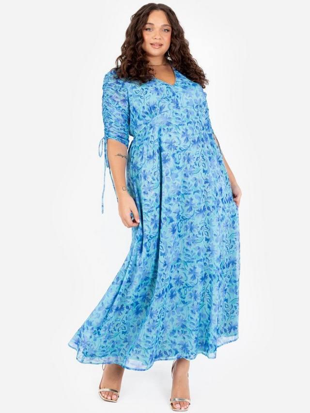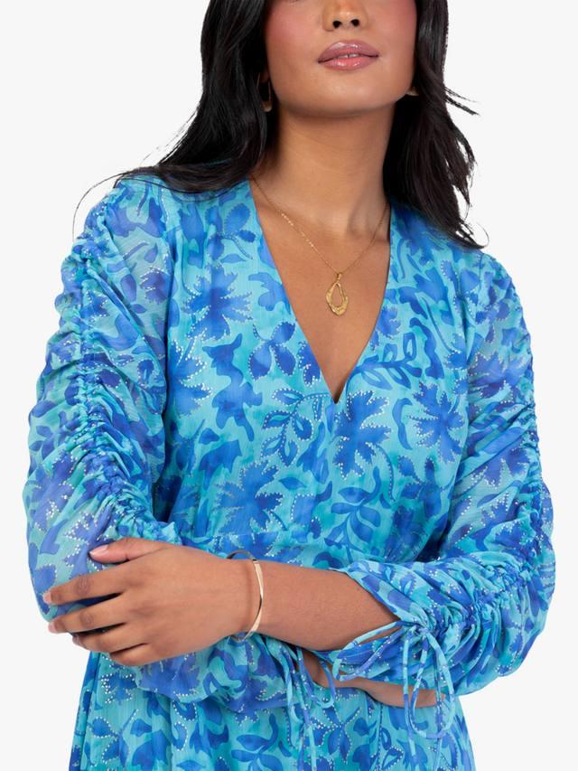 Завышенная талия и классический V-образный вырез этого макси-платья с принтом дополнены золотыми акцентами, подчёркивающими узор из смешанных листьев. Юбка макси А-силуэта элегантно прерывается тонким разрезом до бедра, открывающим вид на обувь. Дополните образ золотыми каблуками и мерцающими аксессуарами, чтобы создать потрясающий образ.