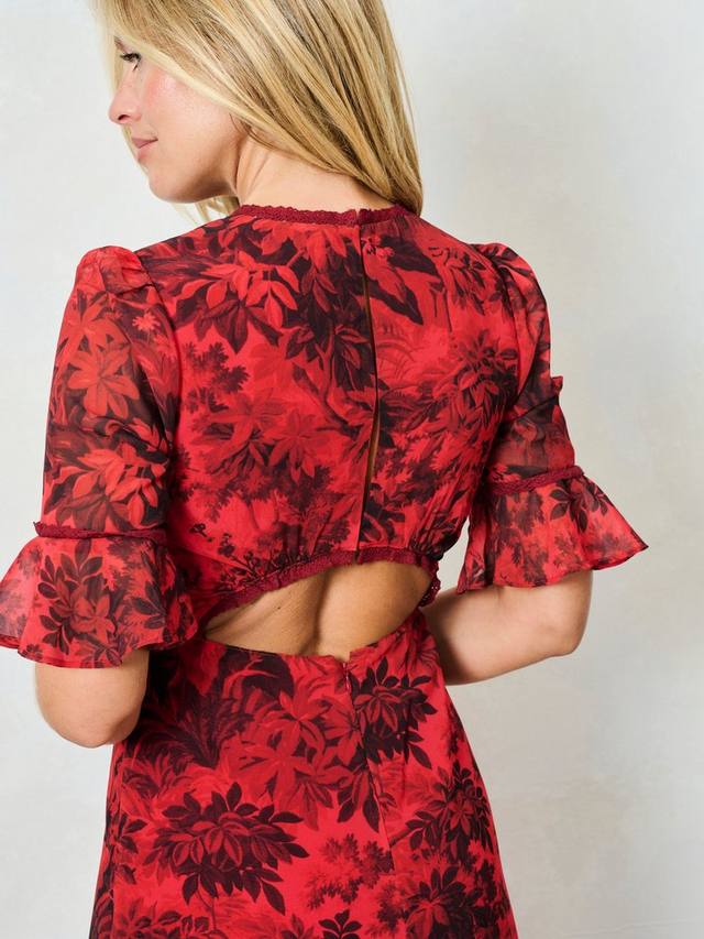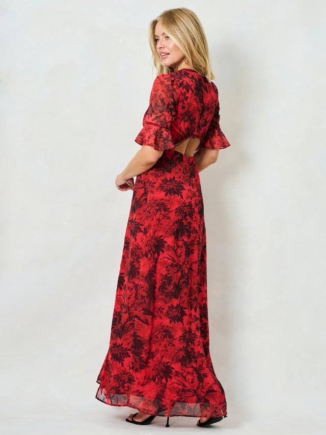 Это великолепное красное платье, созданное вручную в студии Hope & Ivy в Восточном Лондоне, украшено нежными цветами и листвой на насыщенно-красной основе, с приподнятой отделкой на локтях, груди и V-образным вырезом. Вырез на пояснице обеспечивает одновременно комфорт и стиль, делая его идеальным нарядом для гостей на свадьбе в этом сезоне.