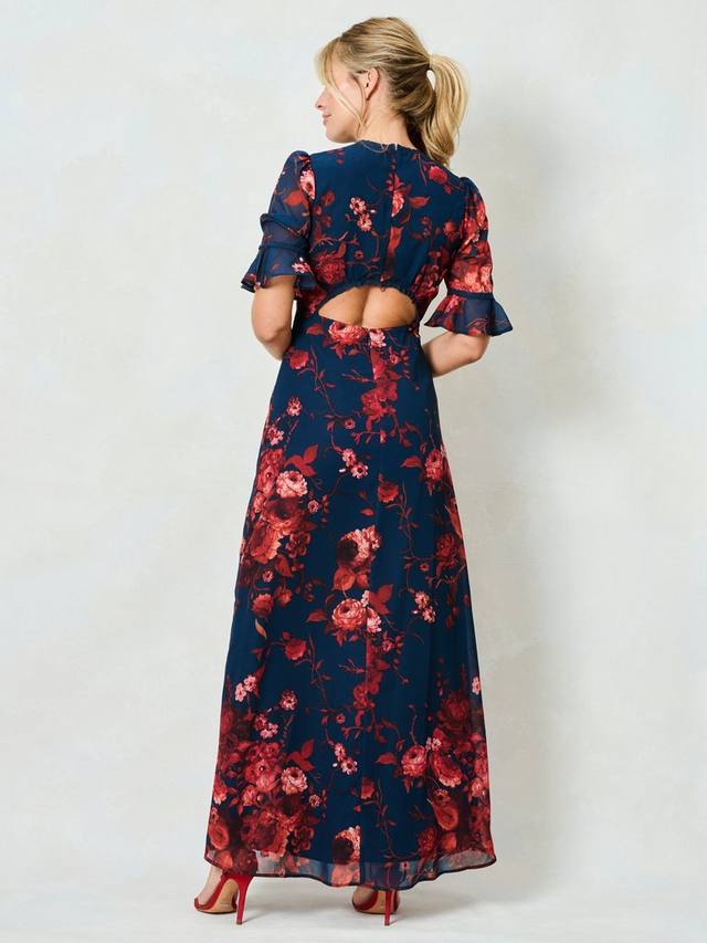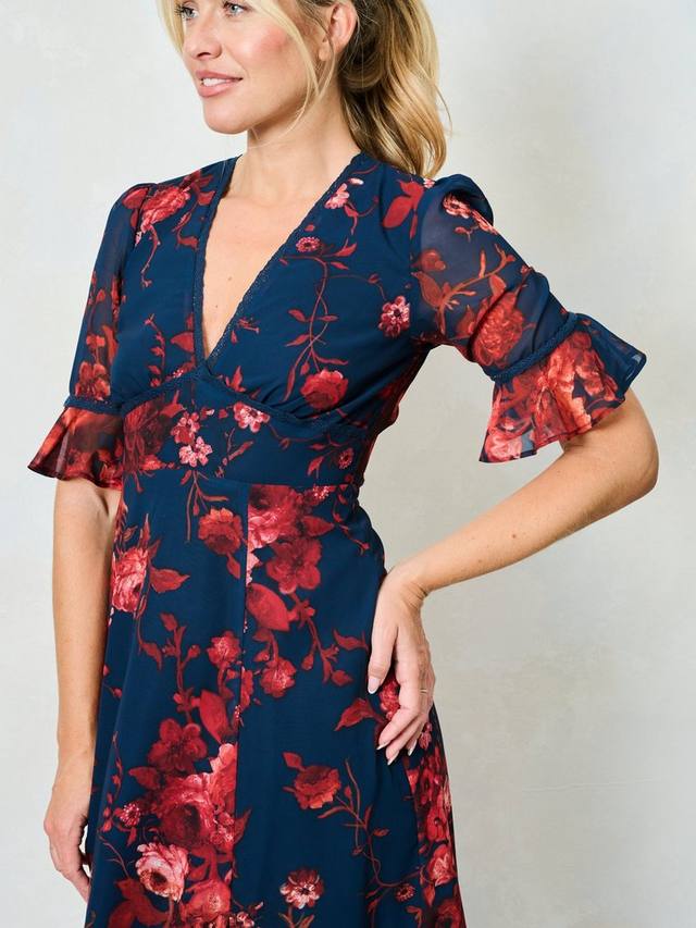 Платье Coraline сочетает в себе лучшее из обоих миров: популярный силуэт Hope & Ivy возвращается с совершенно новым принтом. Платье, вручную стилизованное в их студии в Восточном Лондоне, украшено нежными цветами ярко-красного цвета на фоне насыщенного темно-синего фона.