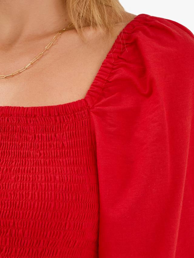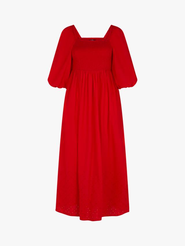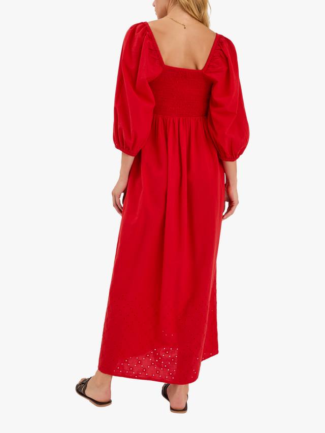Это яркое красное платье, сшитое из дышащего хлопка, имеет объемные рукава-фонарики, эластичный лиф со сборками и струящийся макси-подгиб.