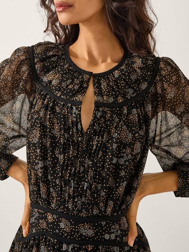 Это макси-платье сочетает струящиеся слои с цветочным принтом, привнося лёгкость и очарование в ваш день. Классический V-образный вырез и длинные рукава обеспечивают свободу движений, обеспечивая вам уверенность и комфорт в любой ситуации.
