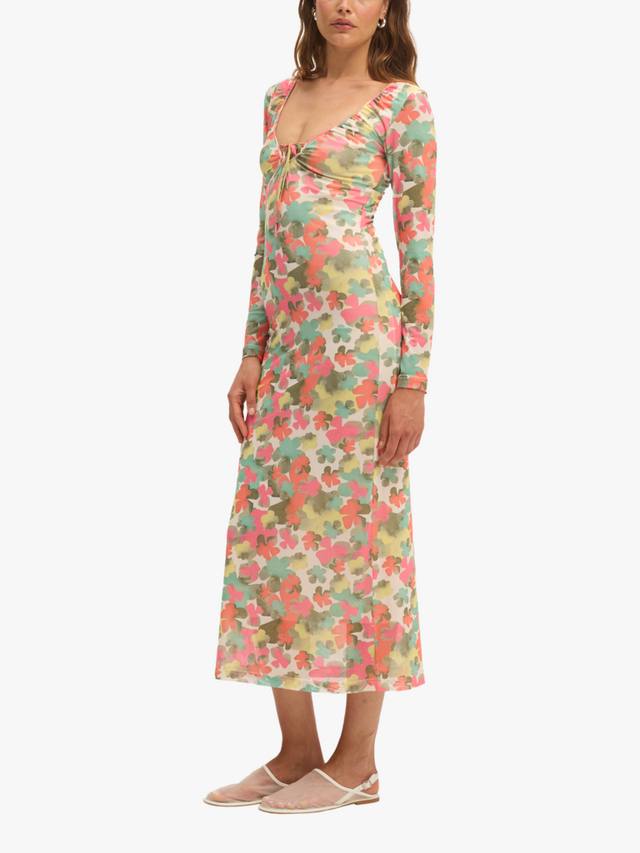 Это платье в пол от SUMMERY Copenhagen, идеально подчёркивающее фигуру благодаря А-силуэту, выполнено из эластичной ткани. Вырез горловины – овальный, длинные рукава – украшены цветочным узором.