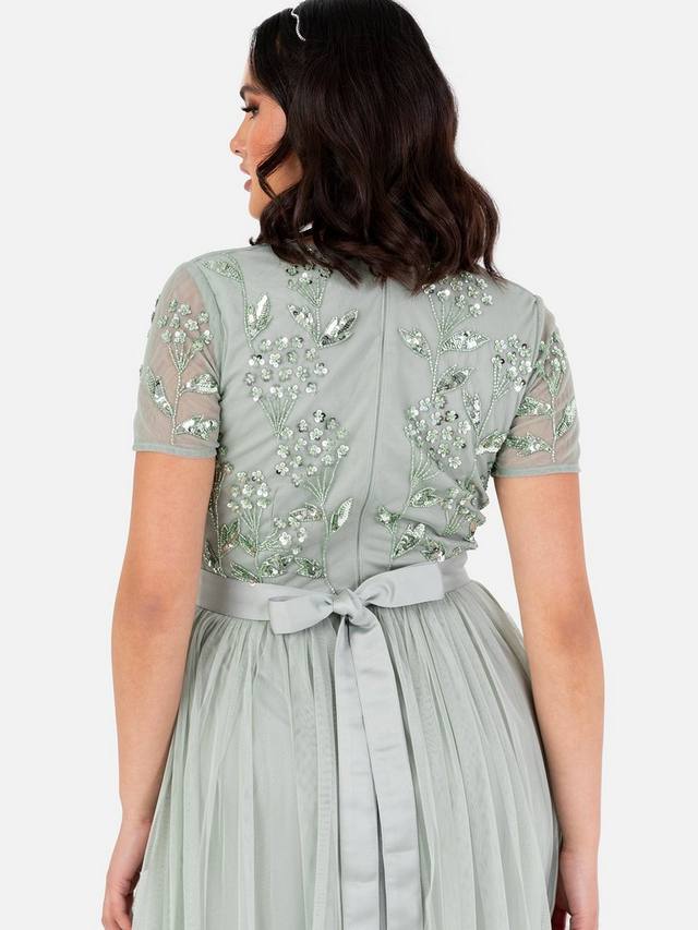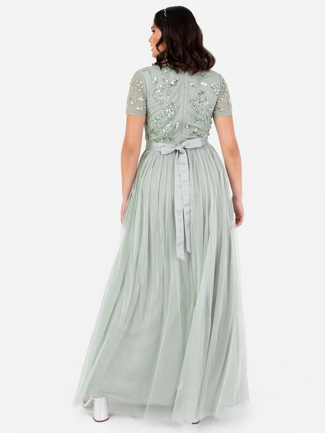 Произведите незабываемое впечатление в этом гламурном платье от Maya Deluxe. Тщательно расшитые пайетки и бусины образуют цветочные мотивы, которые элегантно дополняют V-образный вырез лифа и короткие прозрачные рукава. Тюль переходит в макси-юбку А-силуэта, которая подходит для любой фигуры, делая это платье идеальным выбором для подружек невесты. Дополните образ, дополнив это платье в пол едва заметными каблуками и изящными серьгами.