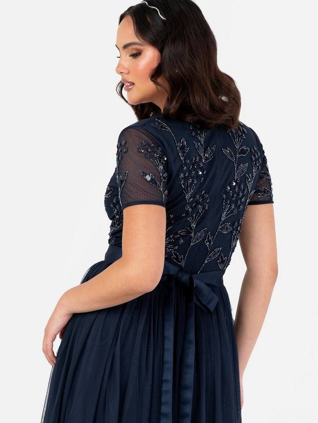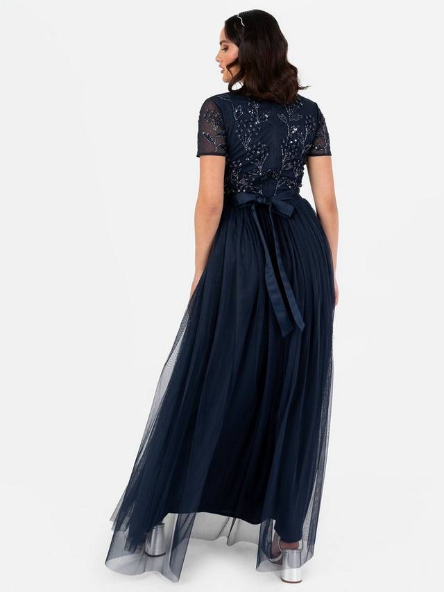 Произведите незабываемое впечатление в этом гламурном платье от Maya Deluxe. Тщательно расшитые пайетки и бусины образуют цветочные мотивы, которые элегантно дополняют V-образный вырез лифа и короткие прозрачные рукава. Тюль переходит в макси-юбку А-силуэта, которая подходит для любой фигуры, делая это платье идеальным выбором для подружек невесты. Дополните образ, дополнив это платье в пол едва заметными каблуками и изящными серьгами.