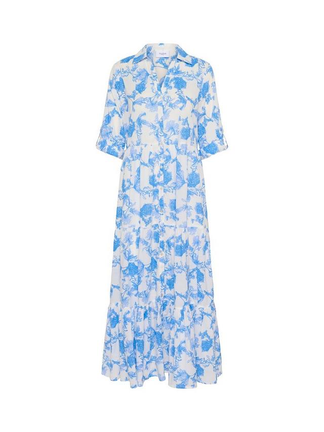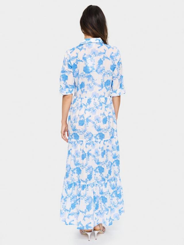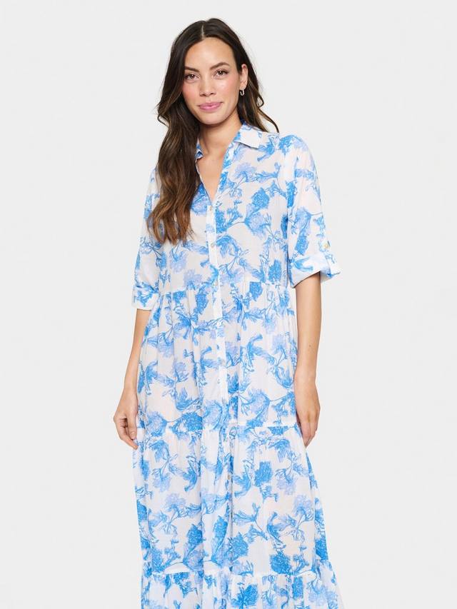 Это макси-платье-рубашка из Сен-Тропе выполнено из лёгкого хлопка с юбкой пышной формы, собранной на несколько ярусов. Модель с простым, но элегантным V-образным вырезом и рукавами длиной три четверти украшена цветочным принтом.