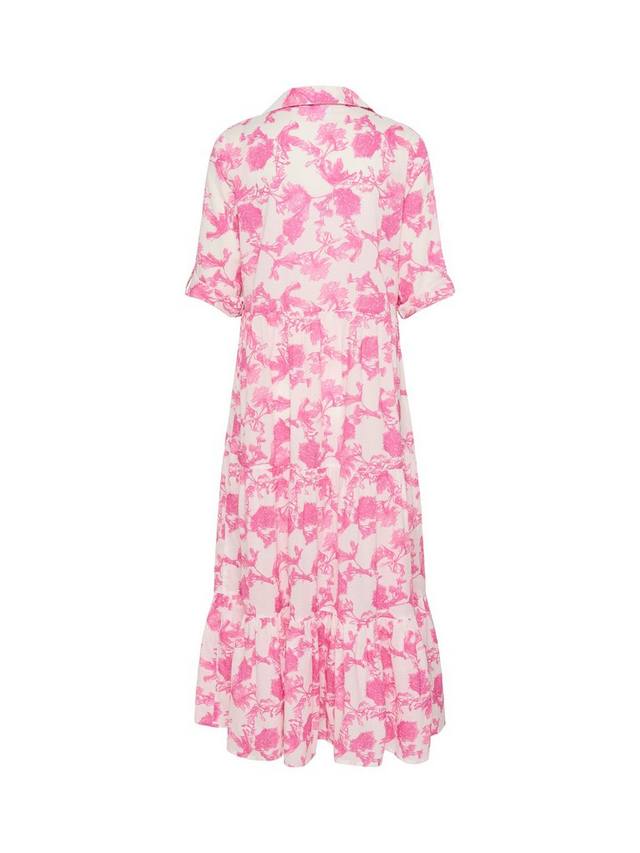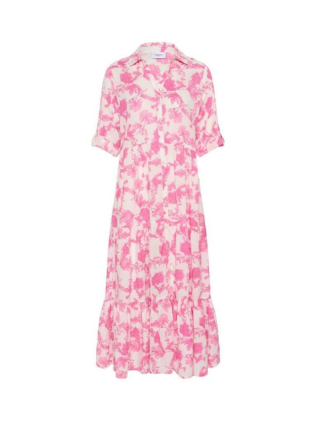 Это макси-платье-рубашка из Сен-Тропе выполнено из лёгкого хлопка с юбкой пышной формы, собранной на несколько ярусов. Модель с простым, но элегантным V-образным вырезом и рукавами длиной три четверти украшена цветочным принтом.