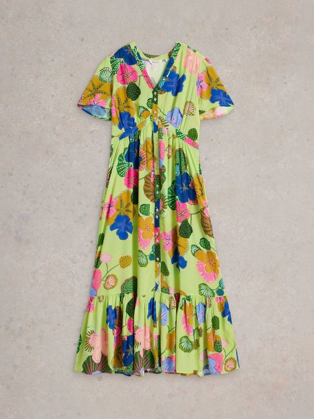 Это платье длиной до пола от White Stuff, А-силуэта, с одноуровневым подолом для создания дополнительной пышности, выполнено из мягкой вискозы. Простой V-образный вырез и короткие свободные рукава очаровывают интригующим цветочным принтом.