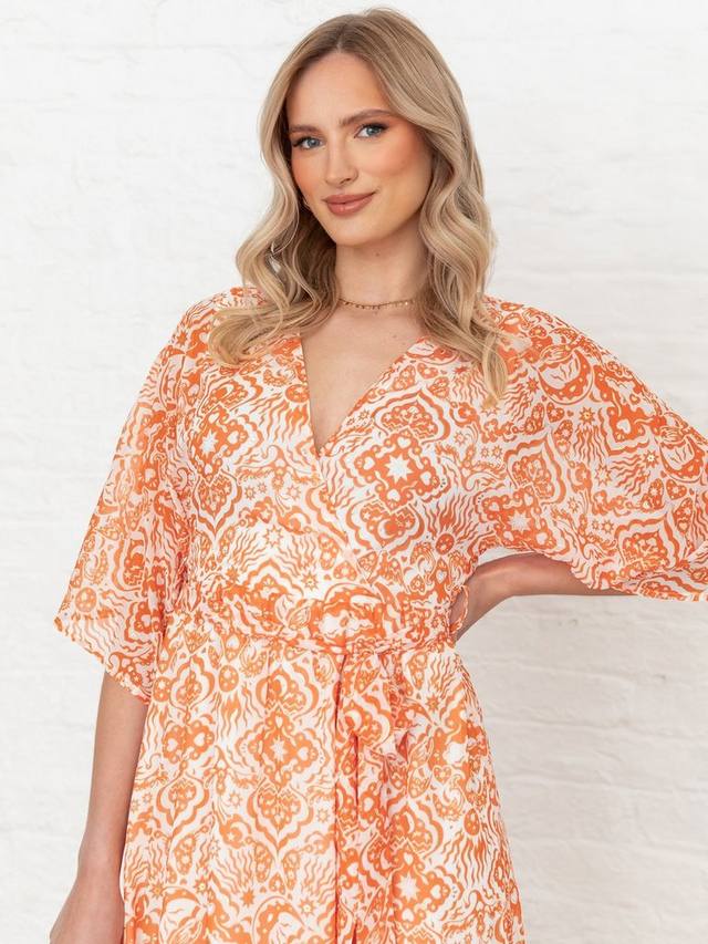 Это воздушное платье мидакси отличается пленительным сочетанием узоров и иллюстраций на лифе в стиле кимоно и струящейся юбке миди, которые оживляют светящиеся акценты из фольги. Имитация запаха спереди создает элегантный V-образный вырез, идеально подходящий для демонстрации изящной подвески. Для изысканного вечернего ансамбля дополните его туфлями на каблуке с ремешками, а для непринужденного дневного образа выберите мюли и сумку с верхней ручкой.