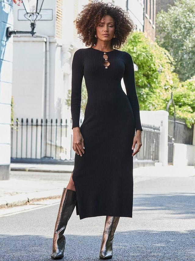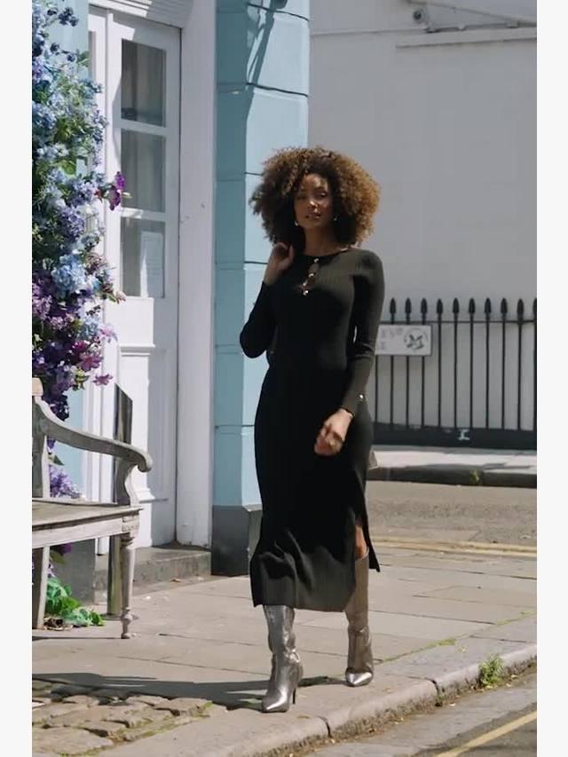 Это платье средней длины в рубчик от Sosandar, прилегающее к фигуре и спускающееся к прямой юбке, выполнено из смеси вискозы для создания невесомого эффекта. Круглый вырез, длинные рукава и вырез на груди с застёжкой на пуговицы.