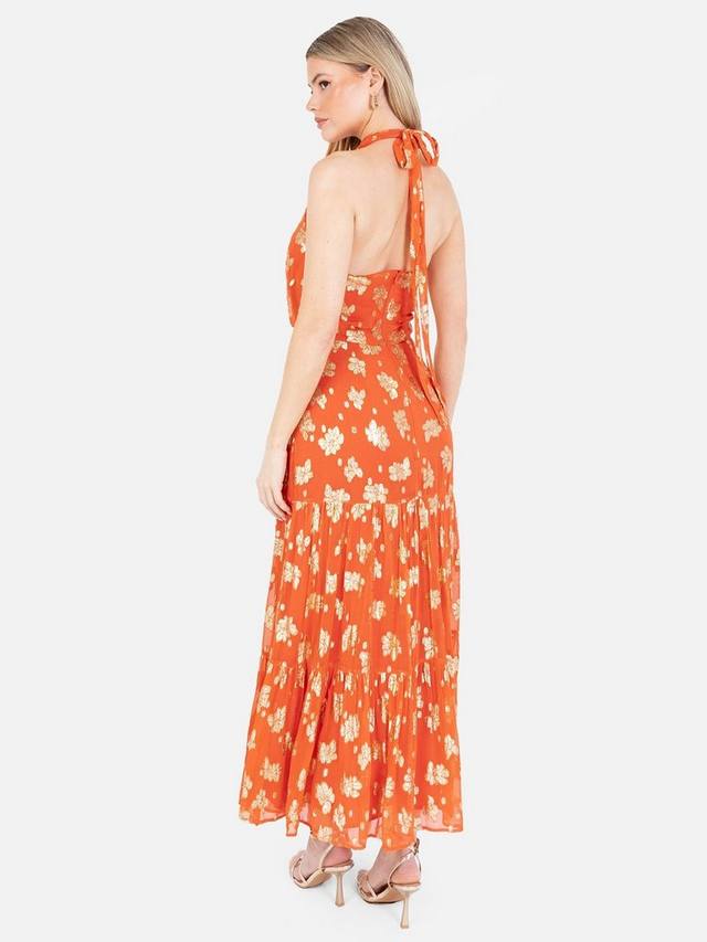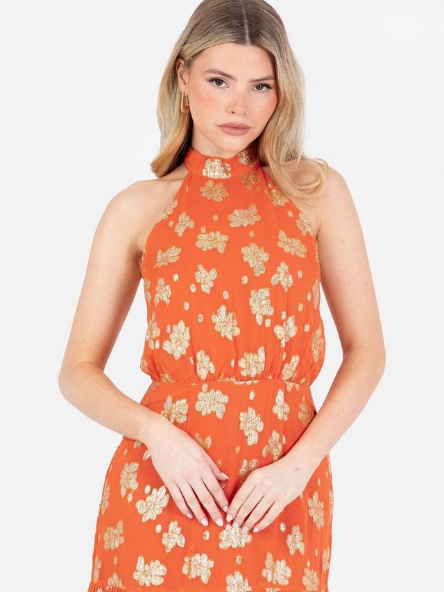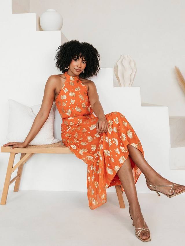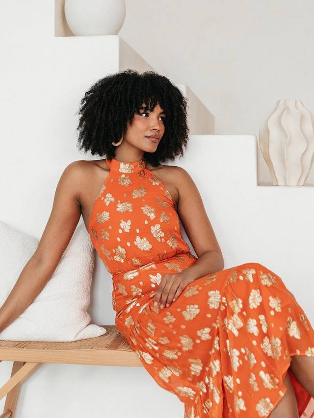 Это яркое платье, выполненное из нежной фактурной ткани, станет идеальным выбором для летних свадеб или элегантных праздничных вечеров. Вырез халтер на завязках и соблазнительная открытая спина подчеркнут его женственное очарование, создавая одновременно изысканный и пленительный силуэт. Горизонтальные вставки на юбке А-силуэта добавляют изящную структуру, а мягкие сборки создают струящийся, воздушный силуэт. Платье с оборкой по подолу, мягко прикрывающему икры, грациозно движется при каждом шаге. Дополните этот шедевр из цветочного жаккарда туфлями на каблуке с ремешками и мерцающими украшениями для создания непринужденного образа.