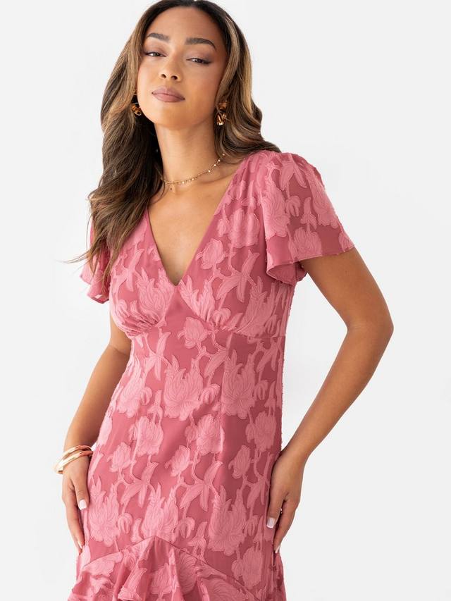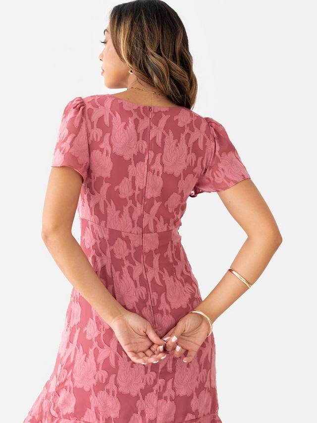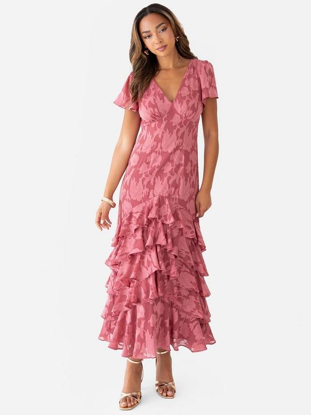 Это платье, от сложного цветочного узора до струящейся юбки с оборками, воплощает непринужденную элегантность для любого особого случая. Оно украшено цветочным принтом и силуэтом мидакси, подчеркнутым такими деталями, как завышенная талия и слегка присборенный лиф, подчёркивающий грудь. Короткие рукава-крылышки добавляют романтики, а многослойные оборки спускаются до подола, прикрывающего щиколотку, создавая эффектную динамику при каждом шаге. Сочетайте это цветочное изделие с эффектными украшениями и туфлями на невысоком каблуке, чтобы создать образ вне времени.