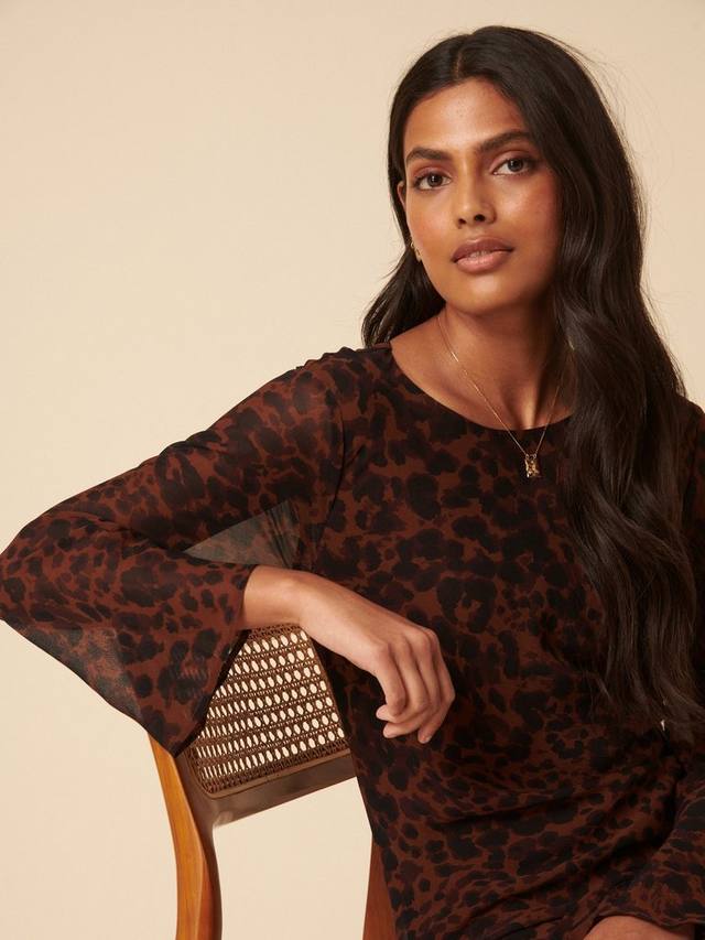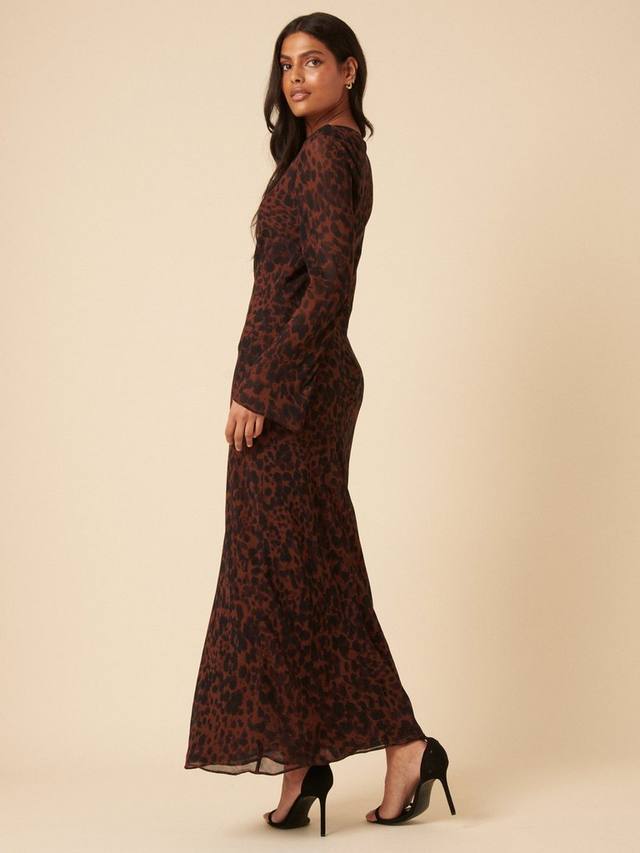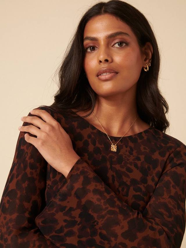 Она — это момент. Это платье миди с коричневым анималистичным принтом, круглым вырезом и длинными расклешенными рукавами, придающими изделию особый шарм. Сочетайте с черными каблуками.