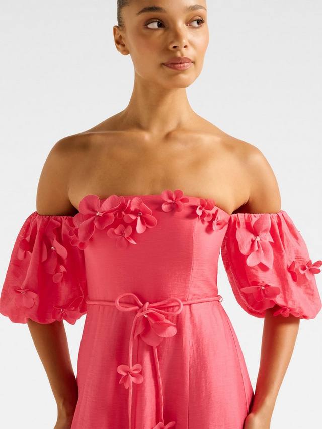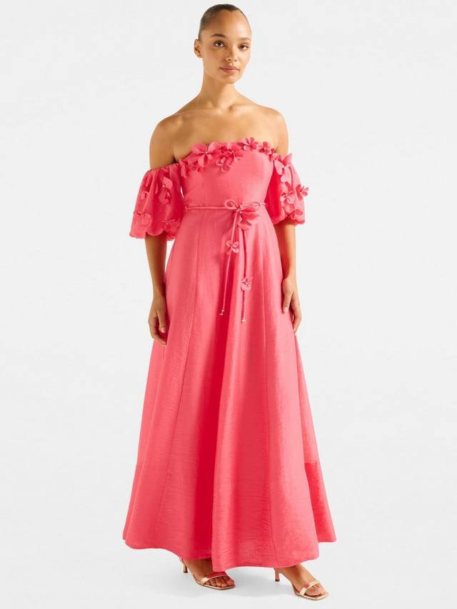 Это макси-платье от Forever New с лёгким силуэтом в стиле бохо выполнено из лёгкой, воздушной льняной ткани. Простая структура с вырезом бардо и короткими рукавами-буфами дополнена объёмными цветочными аппликациями.