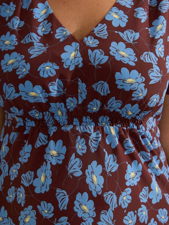 Это платье миди с великолепным цветочным принтом станет ярким акцентом вашего гардероба и выдержит испытание временем. V-образный вырез и красивые сборчатые детали придают платью особую элегантность. Короткие рукава и длина миди создают потрясающий силуэт при любом движении.
