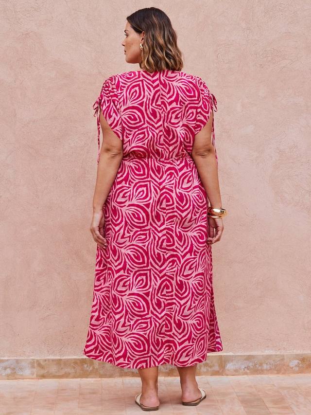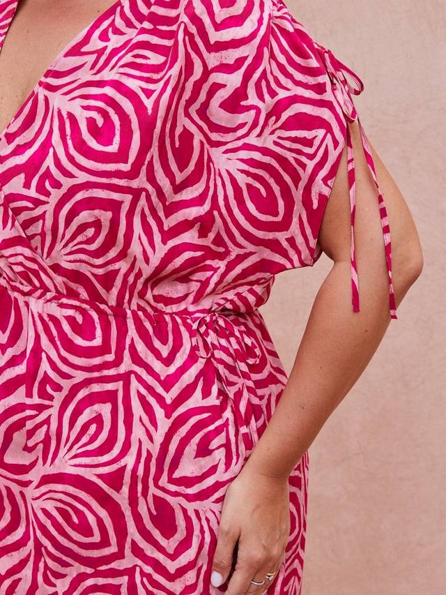 Это платье с красивым абстрактным принтом станет ярким акцентом вашего гардероба и станет отличным дополнением к любому сезону. Оно имеет привлекательный V-образный вырез, а фиксированный крой с запахом добавляет множество деталей. Присборенные детали на рукавах, а длина миди создает красивый силуэт.